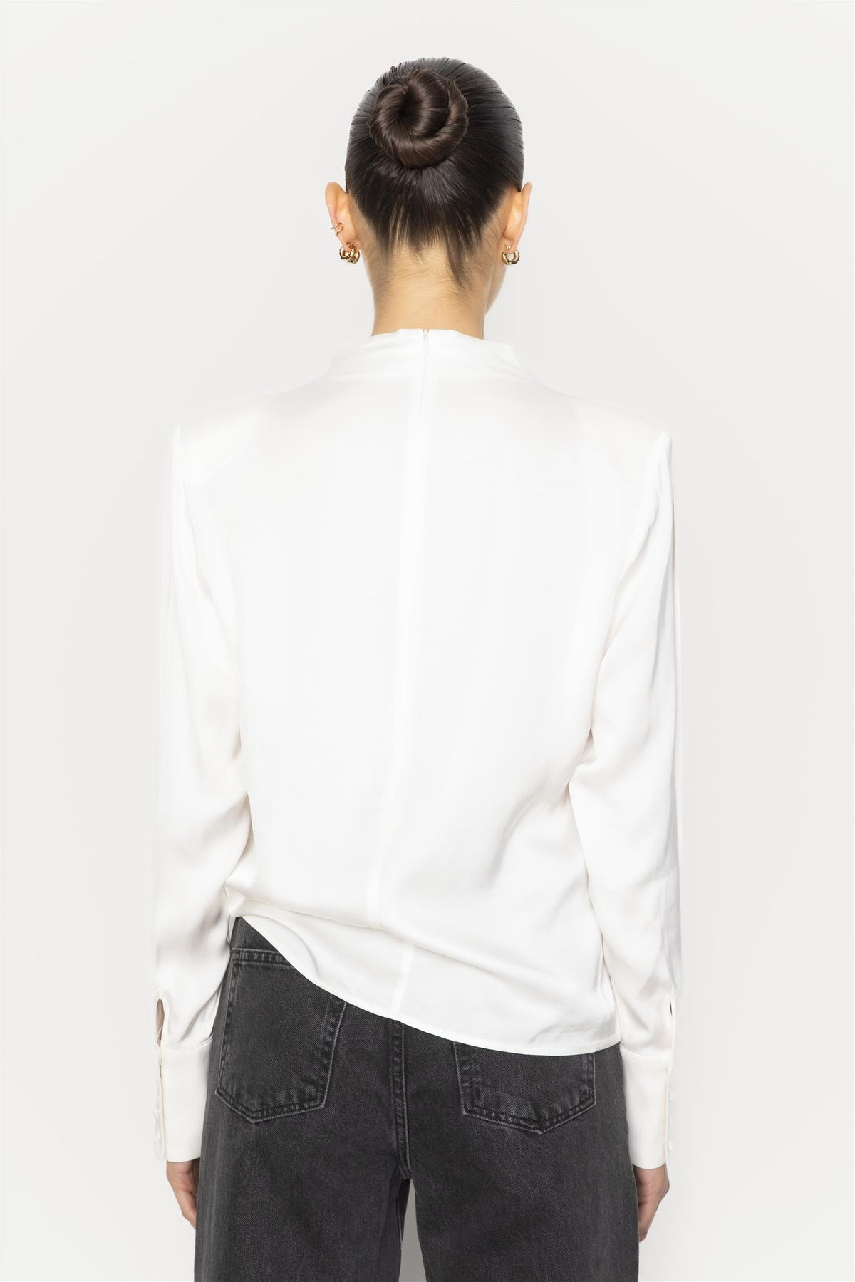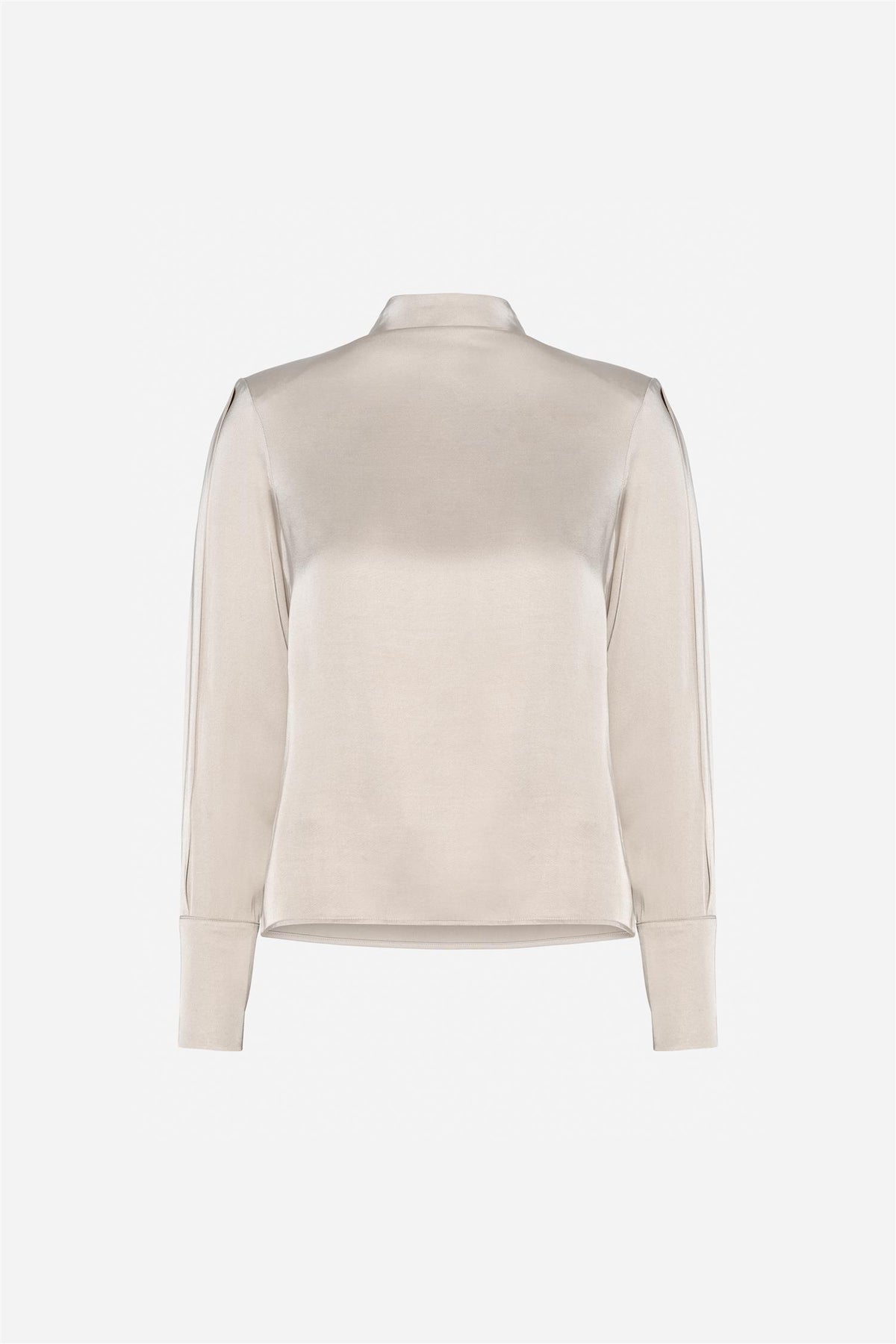 En elegant satengbluse med markerte skulderputer og en dekorativ høy hals med myk fosseffekt. Ermene er pyntet med plisserte detaljer og avsluttes med mansjetter med knapper. Et allsidig plagg som passer like godt til skjørt som til en klassisk denimlook.