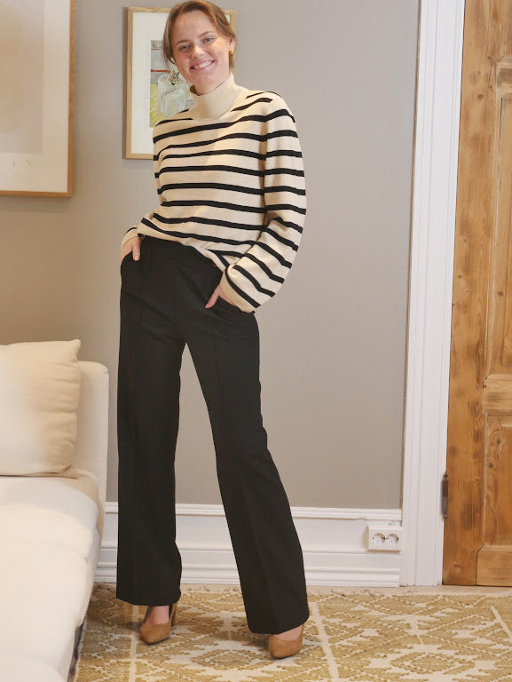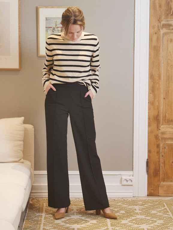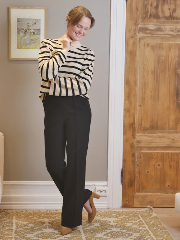 Ava er en vakker buksemodell fra Cambio, men utseende kompromisser ikke på komforten. Ava er nydelig og enkel å ta på, med kun en bred strikk i livet. Fine sømmer foran på buksen, lange og vide ben.