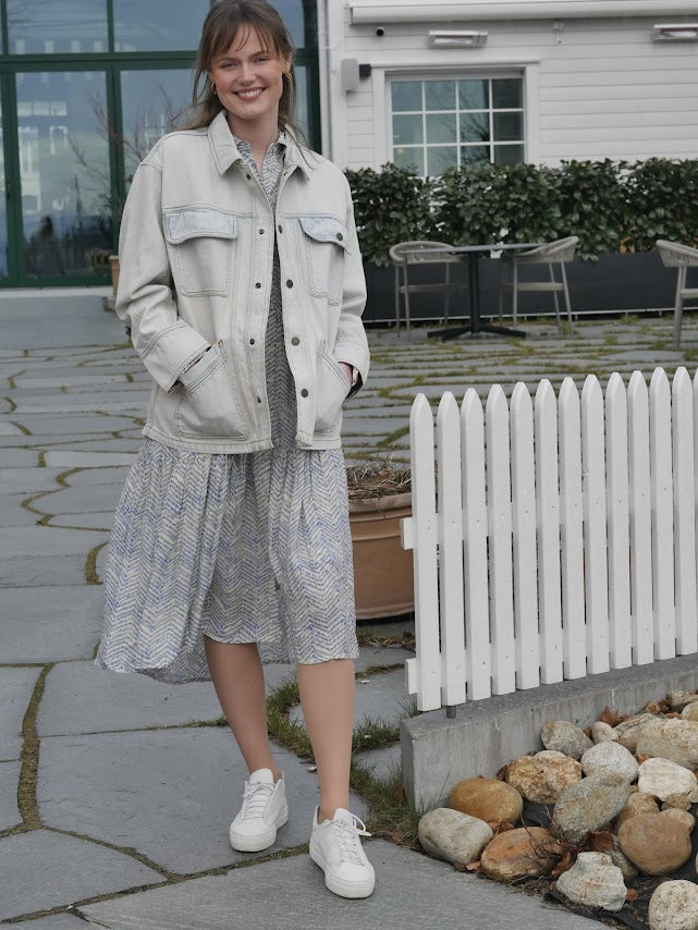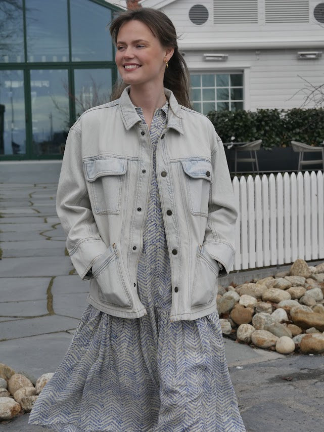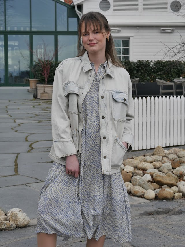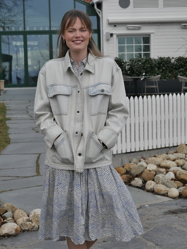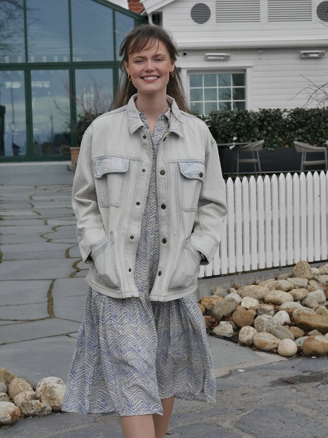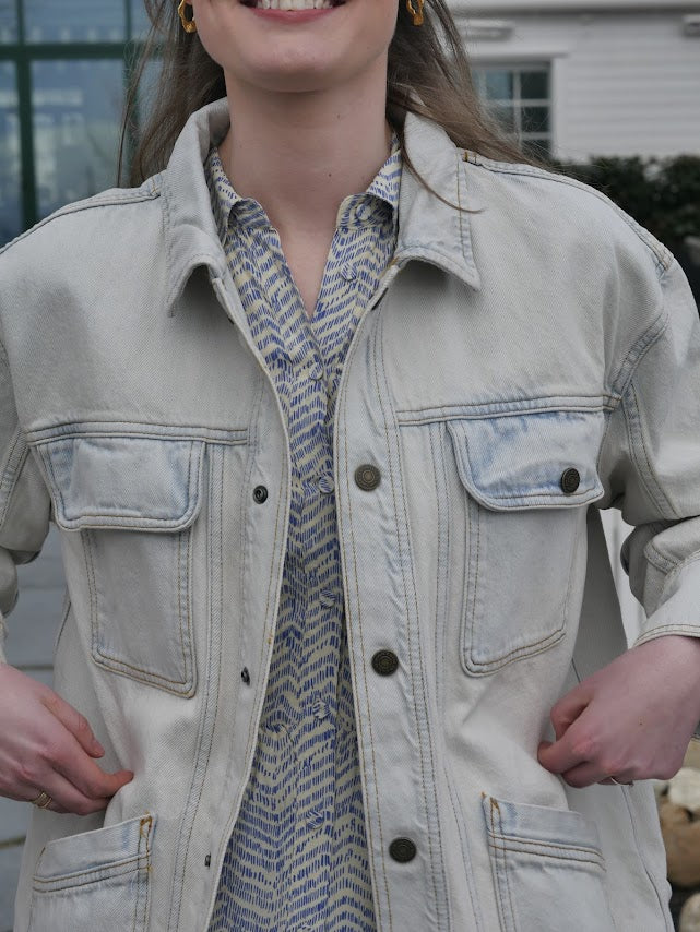 En trendy og kul jeansjakke med store lommer foran. Den har en oversized passform, krage og markerte knapper. Den er utrolig flott på.