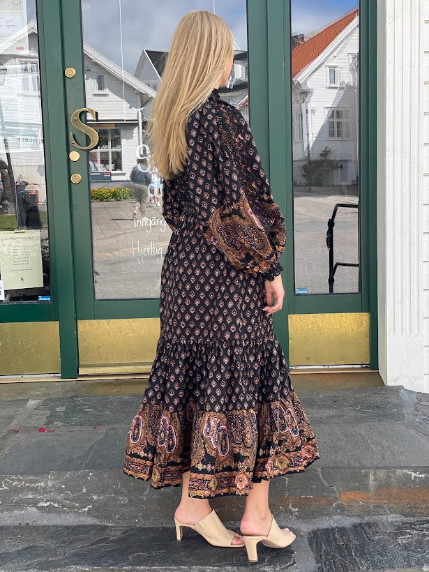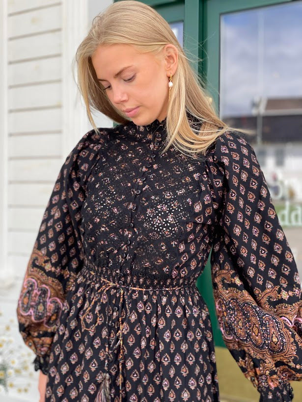 Fantastisk høstnyhet fra byTimo med et nydelig print. Midi-lengde med et stort volumiøst skjørt. Lange ermer med puff, vakre broderidetaljer og strikk nederst. Strikk i livet med knyting og knapper i front. En bohemsk drømmekjole med masse retrovibber.