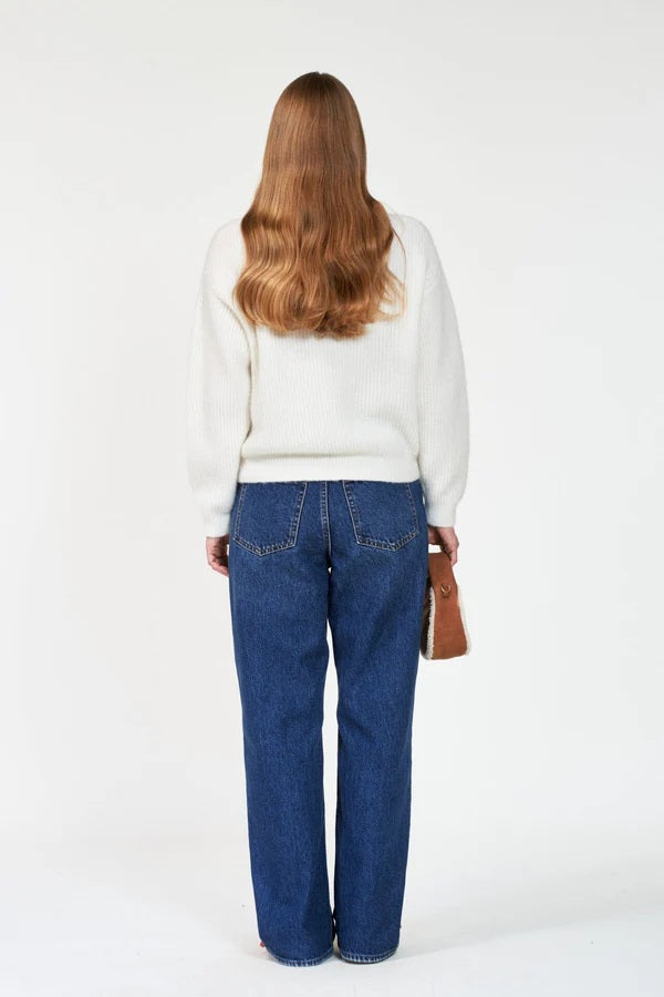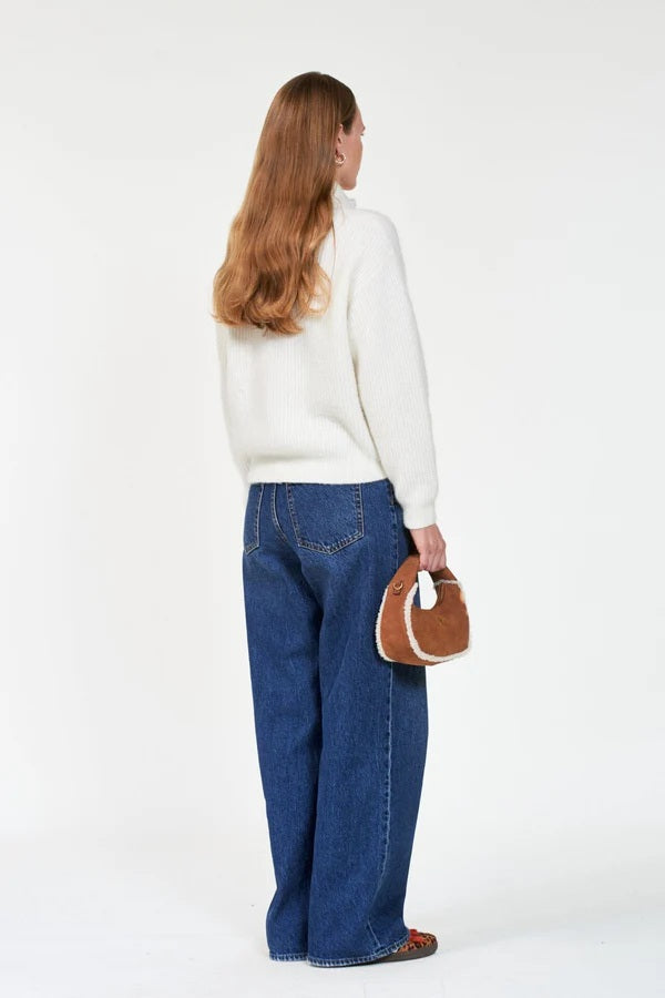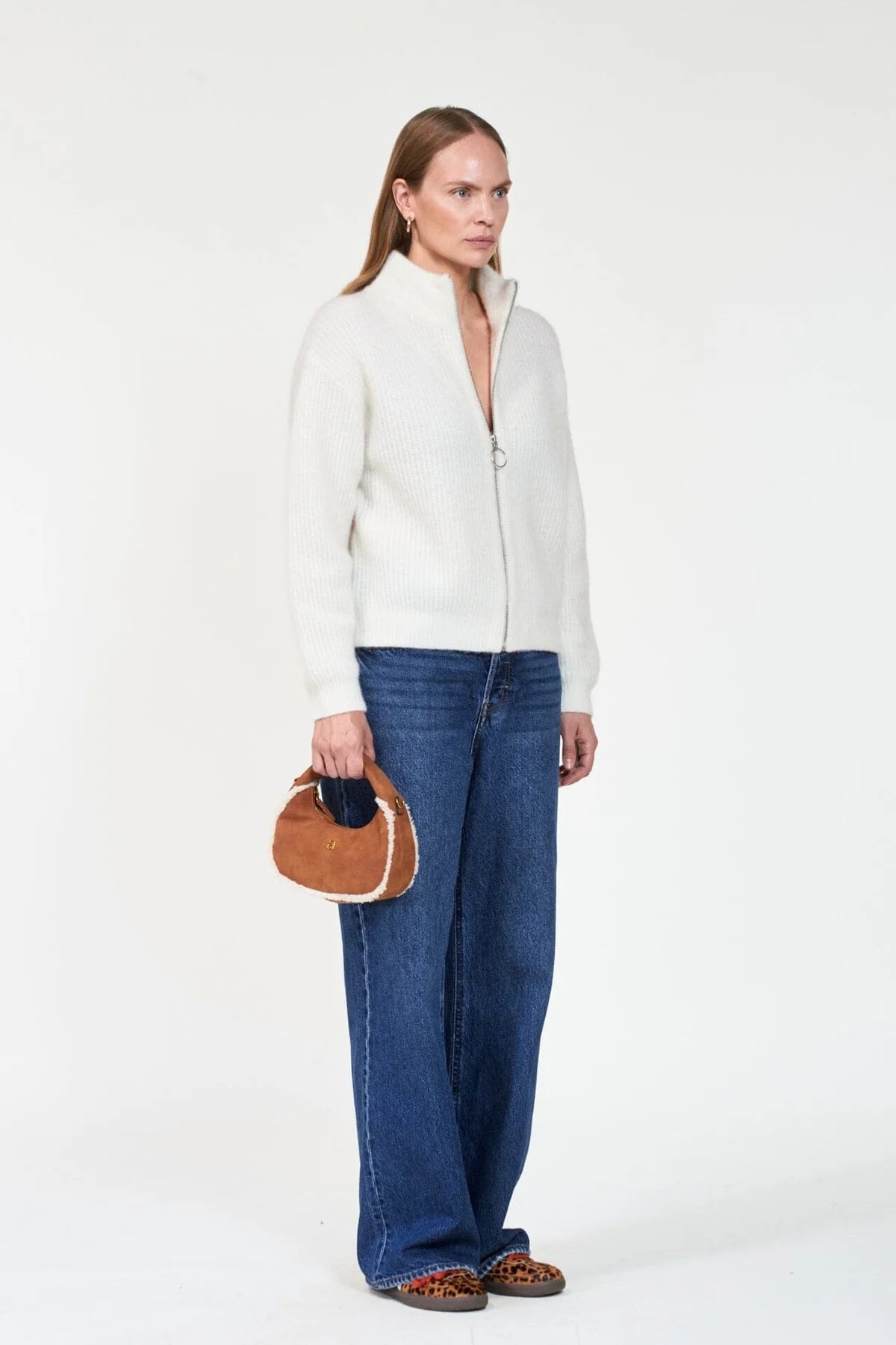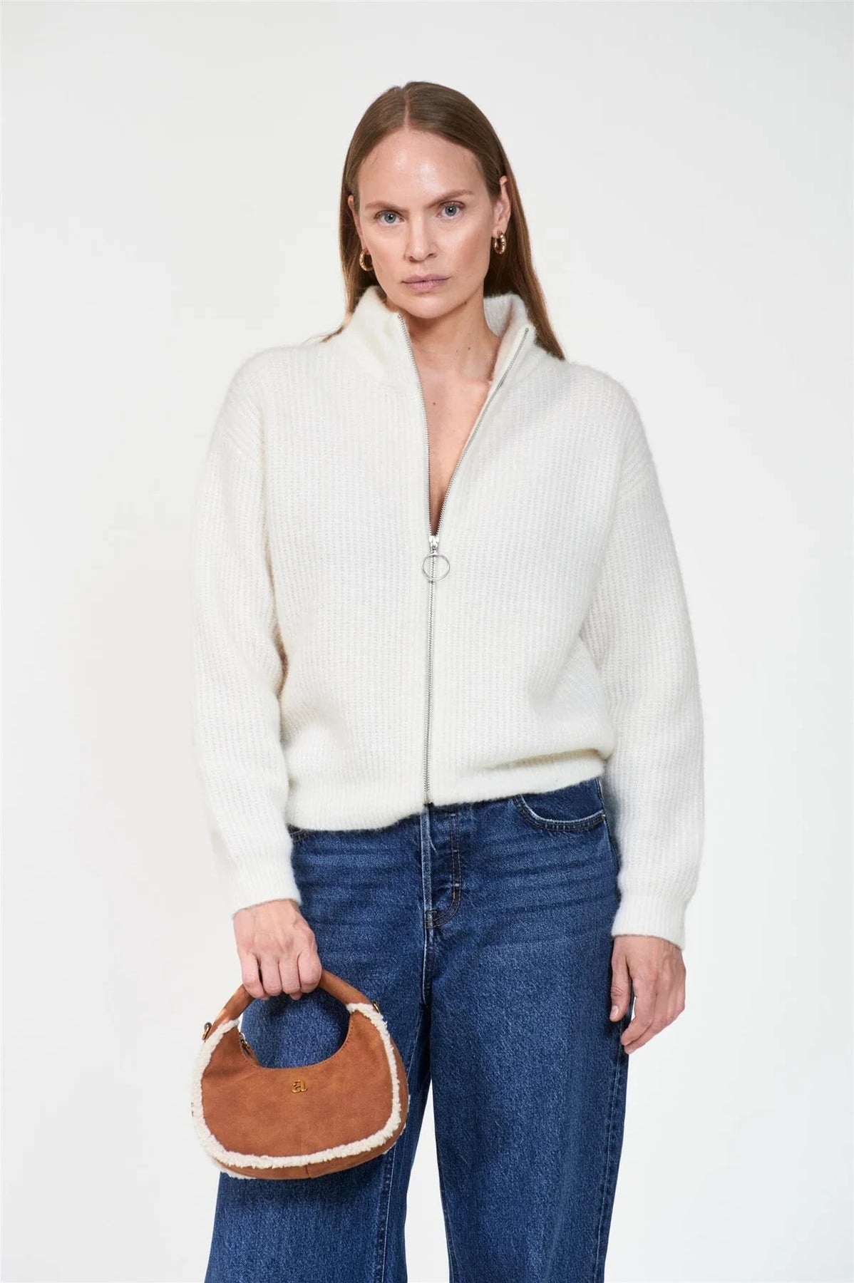 Denne stilrene cardiganen er strikket i en kompakt og myk alpakka- og ullblanding som gir både varme og komfort. Designet har et moderne uttrykk med halvhøy hals og glidelås med dekorativ ring – en sporty detalj som gir plagget karakter. De nedfalne skuldrene og lett voluminøse ermene skaper en avslappet, men sofistikert silhuett. Fasongen er rund med et tettsittende liv som fremhever figuren på en flatterende måte. Perfekt både til hverdags og som et stilig lag over antrekket.