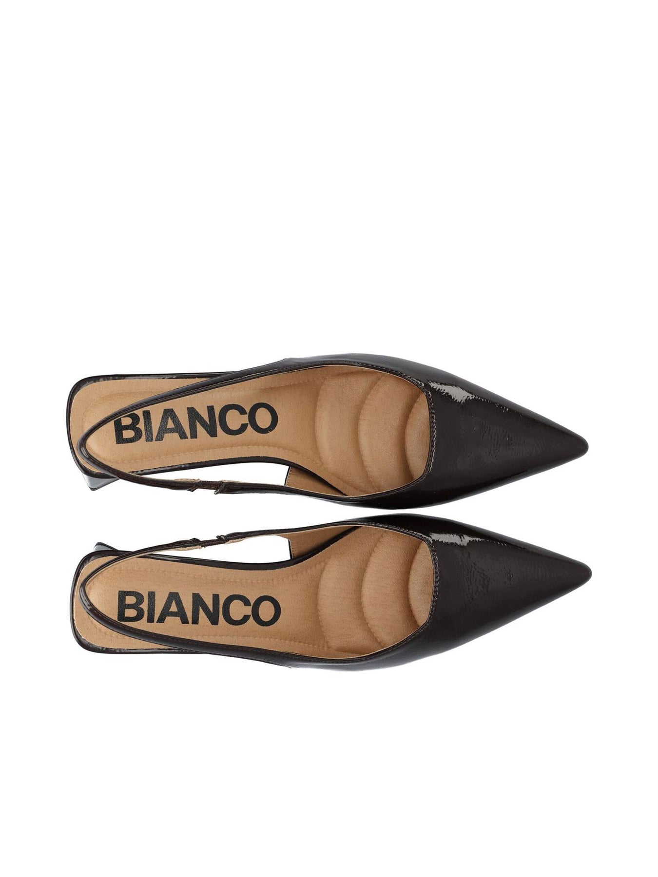 Elegante og tidløse pumps i glansfullt patentskinn fra Bianco. Skoen har en spiss, lukket tå, elastisk slingback og en stabil, komfortabel blokkhæl.