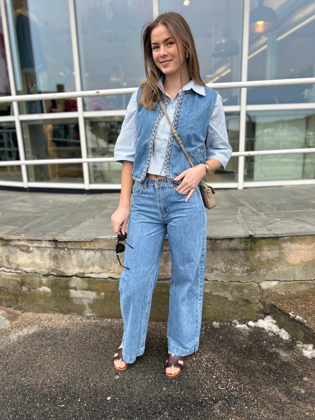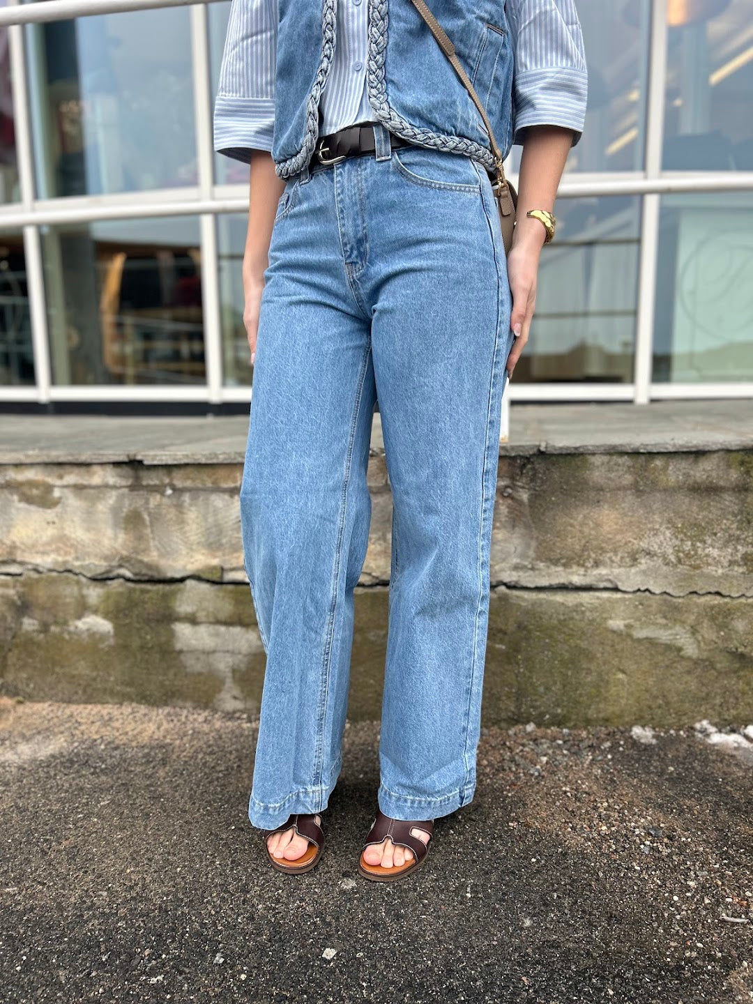 Klassiske jeans i 100% bomull. Buksen har høyt liv og lange rette ben. Kul flettedetalj som matcher så bra med Verona vest. 5-lommer, glidelås lukking.
