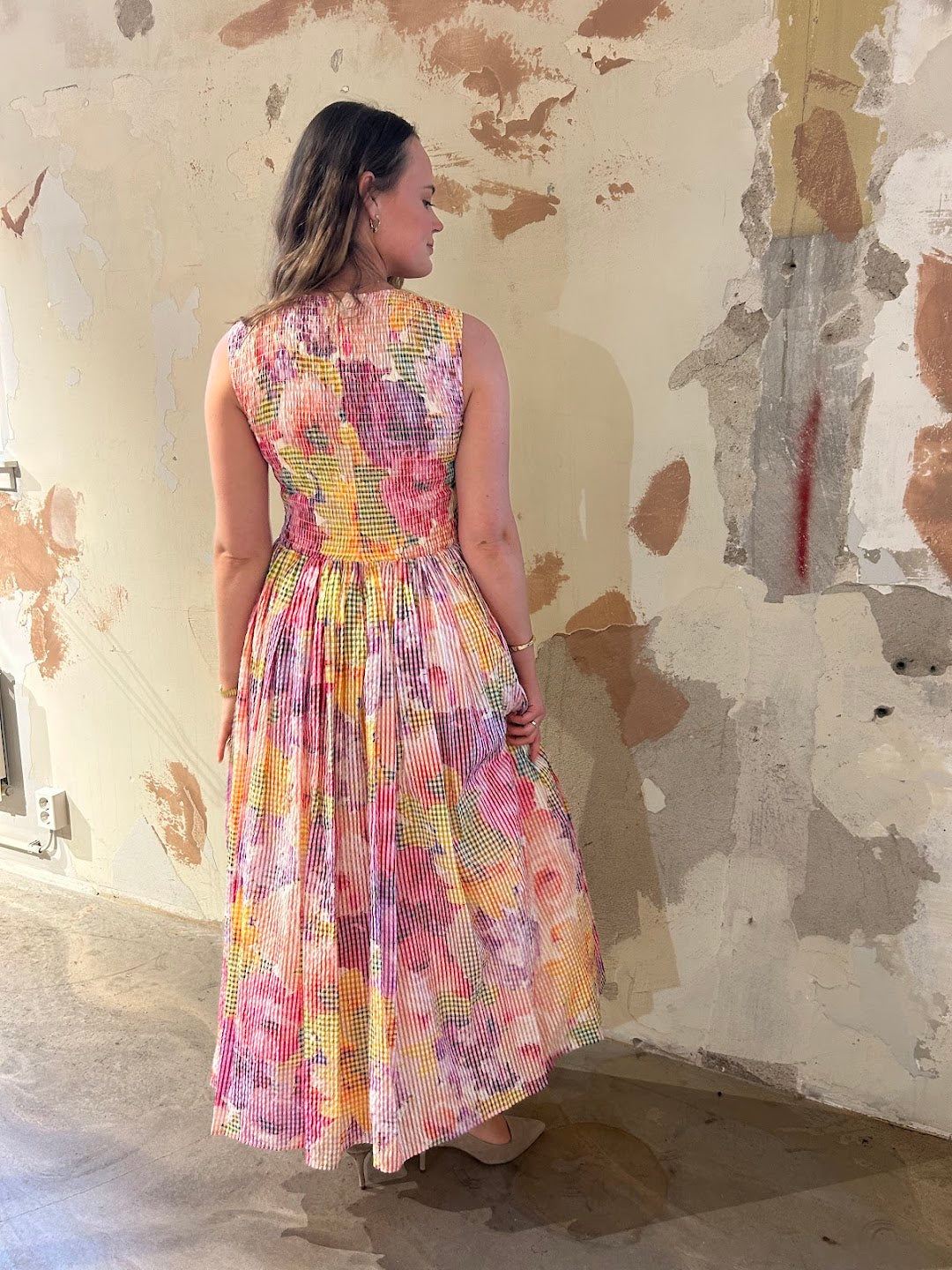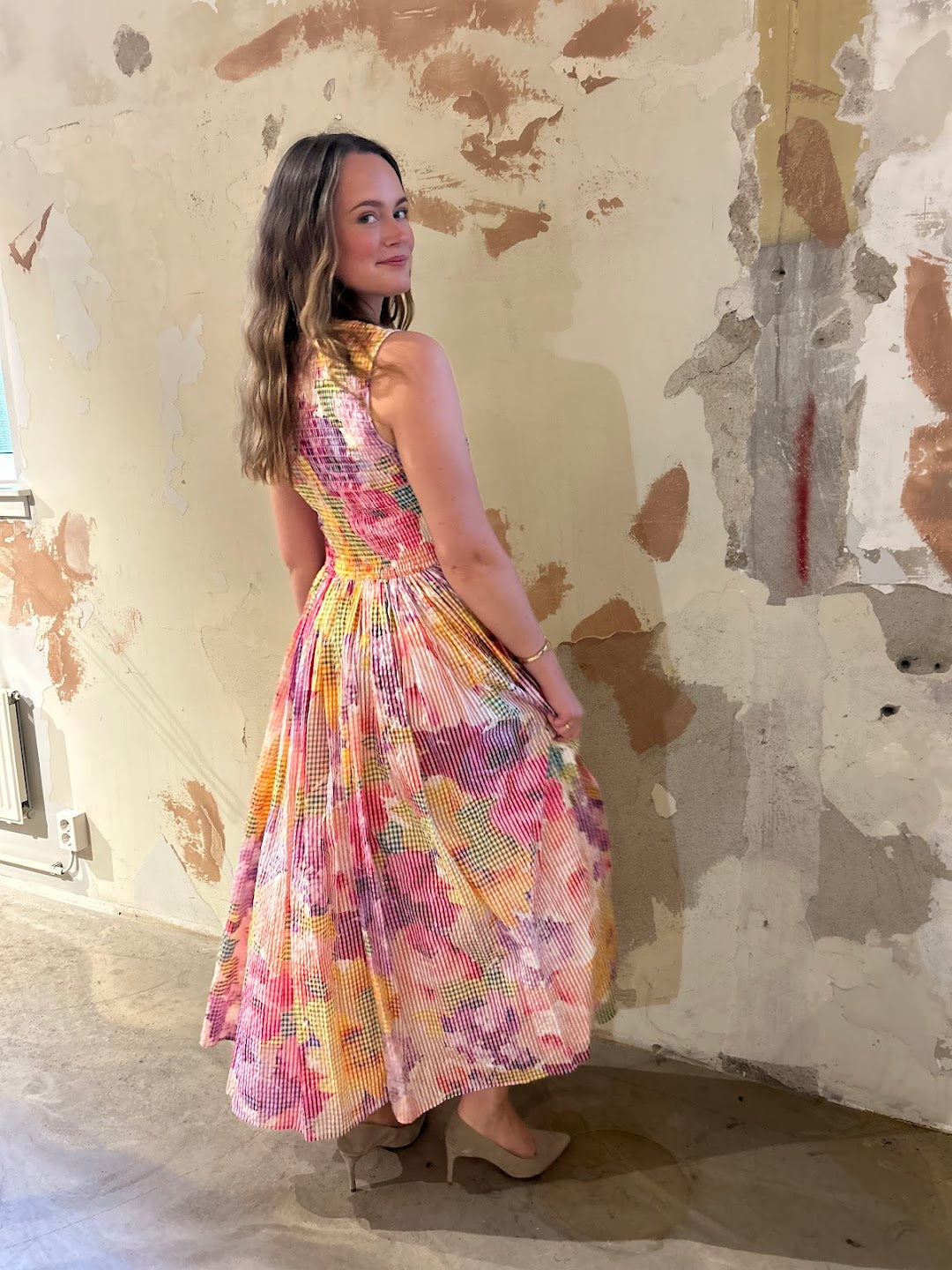 Herlig sommerdrøm av en kjole, en ny modell fra byTimo vi elsker! Stoffet er kreppet og med ruter, herlig fargerikt print over. Skjørtet har ekstra volum og tyll. Toppen har smocking, brede stropper og glidelås bak.