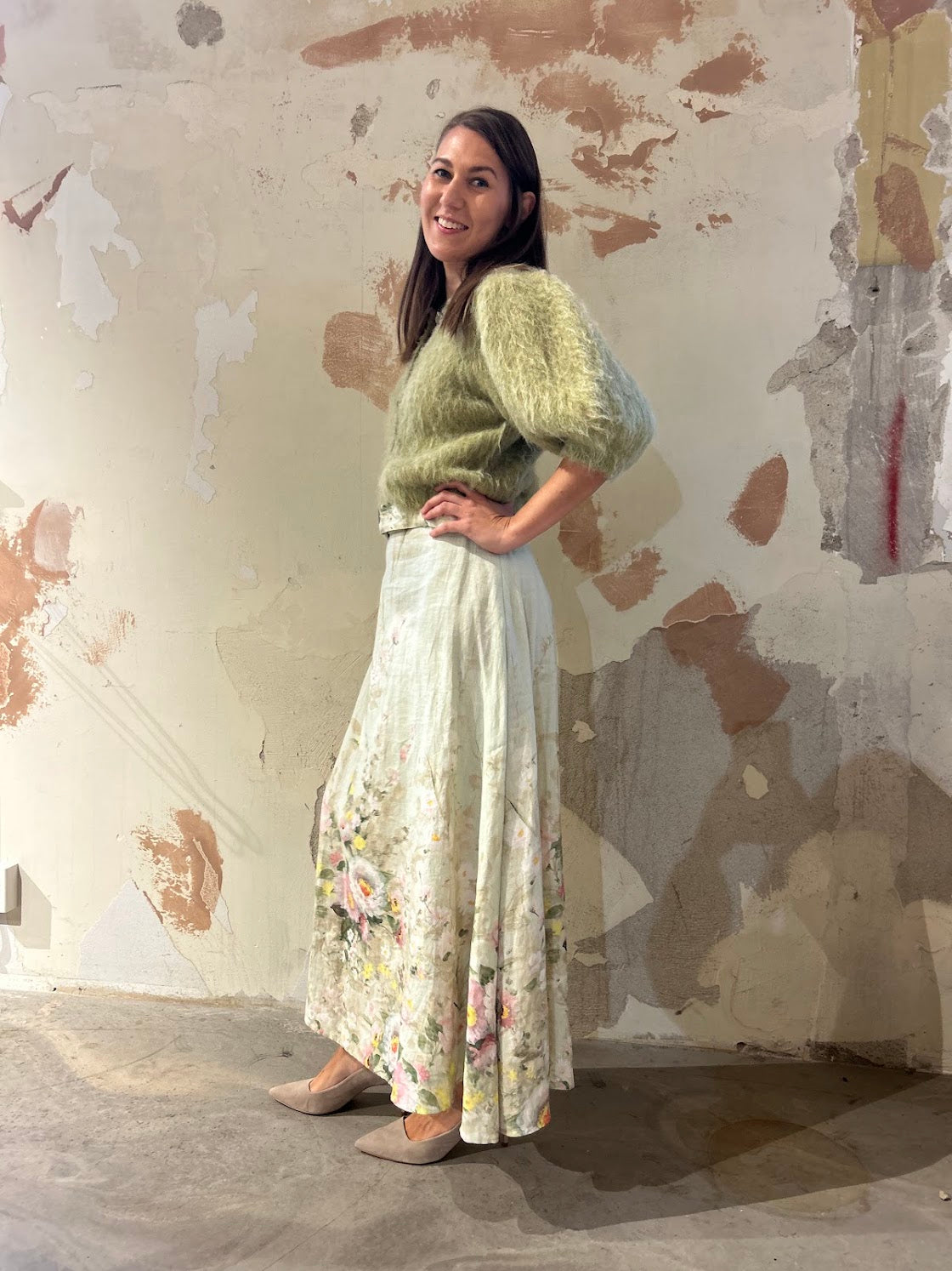 Skjørt er trendy! Nydelig maxiskjørt i en lett og eksklusiv linkvalitet. Skjørtet har høyt liv med trekt belte. Glidelås i siden og strikk bak. Passer til så mye, til hverdags med enkel t-skjorte eller finere anledninger med en bluse eller pen strikk. Strikken på bildet er også fra byTimo og heter Harry Knut Puffed Jacket.