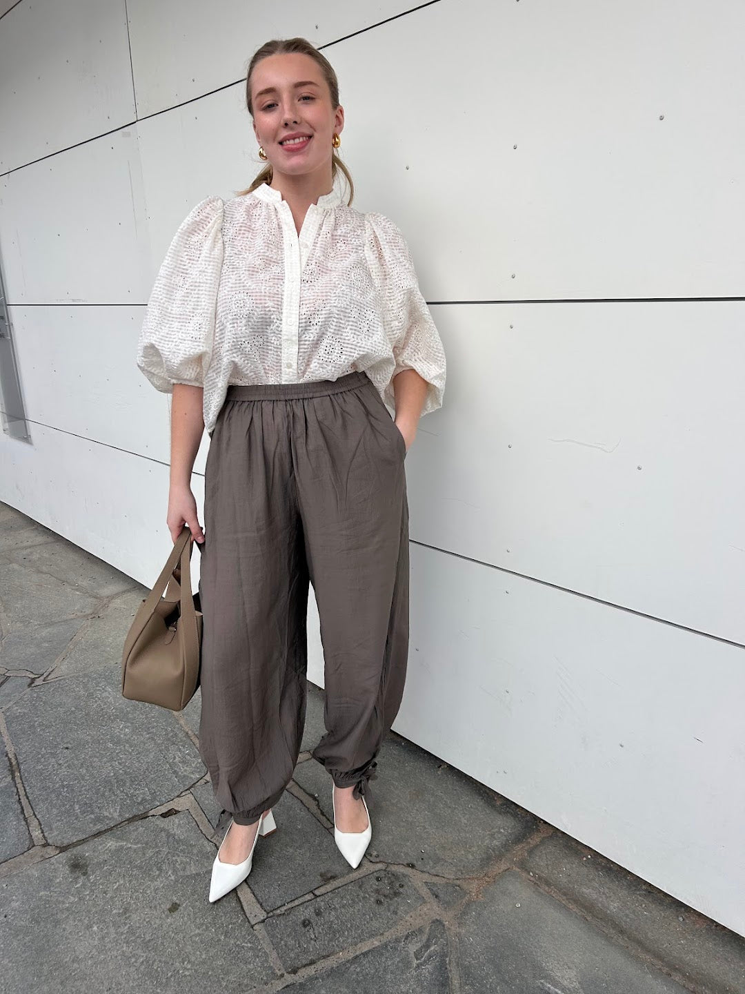 Vi elsker denne nye serien fra byTimo. Kommer i et lett og kreppet stoff, med diskre ruter, brodert print og hullblonder! Blusen har en feminin og avslappet passform. Halvlange puffermer, full knappestolpe og vid, rett passform. Denne blusen kan brukes til fest og hverdags og passer til så mye!
