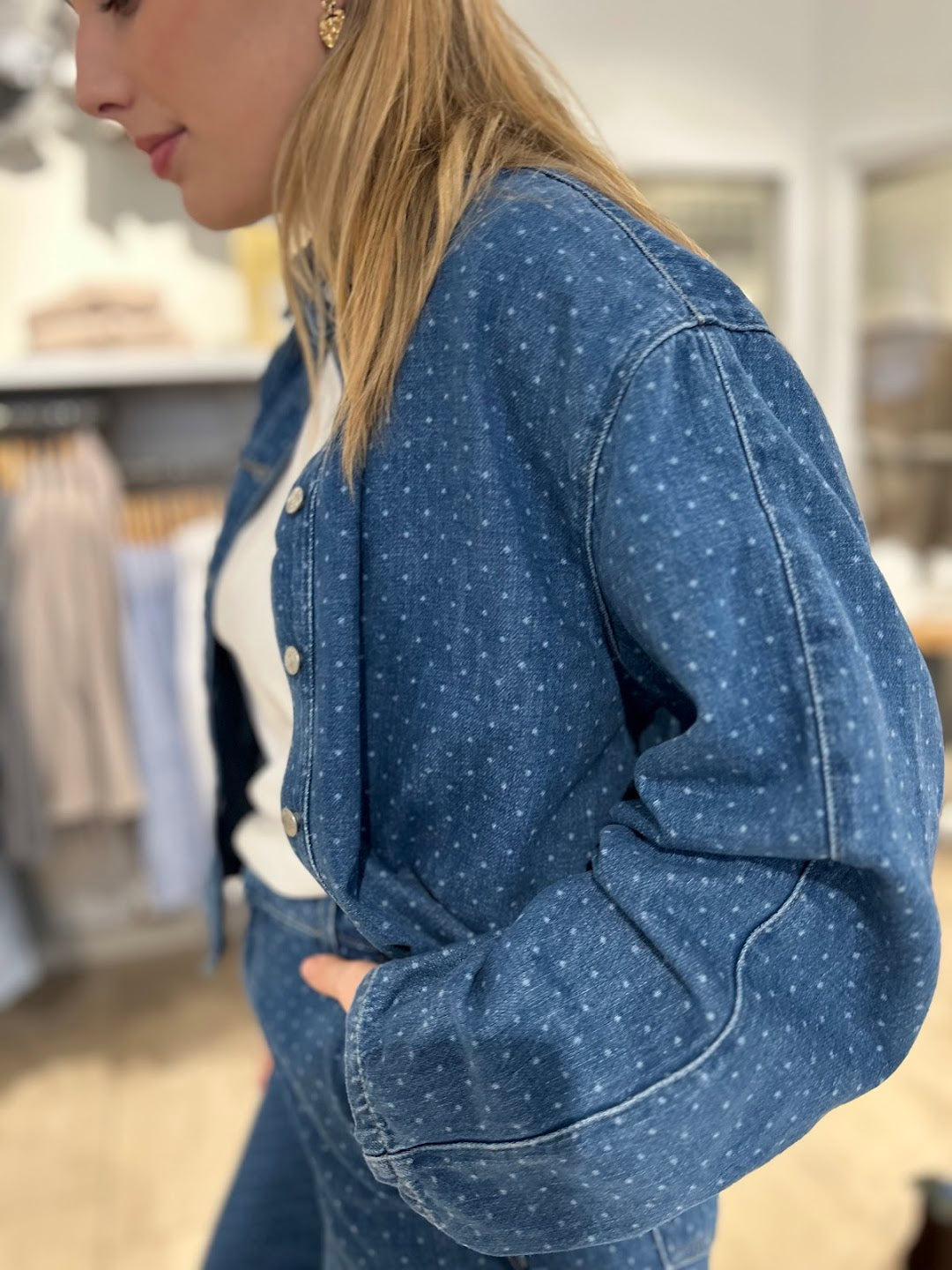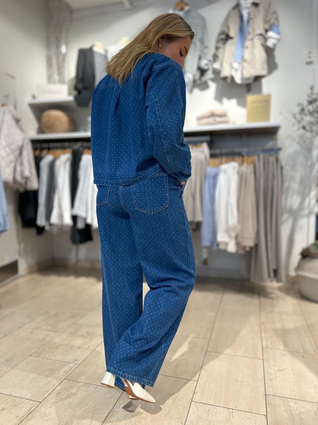 Så kul og trendy denimskjorte. Prikkene gir et lekent og kult uttrykk som vi elsker. Et must denim plagg til våren som skiller seg ut. Den har en oversized look. Kort lengde, perfekt til en highwaste bukse. Kommer i en myk og behagelig denim.