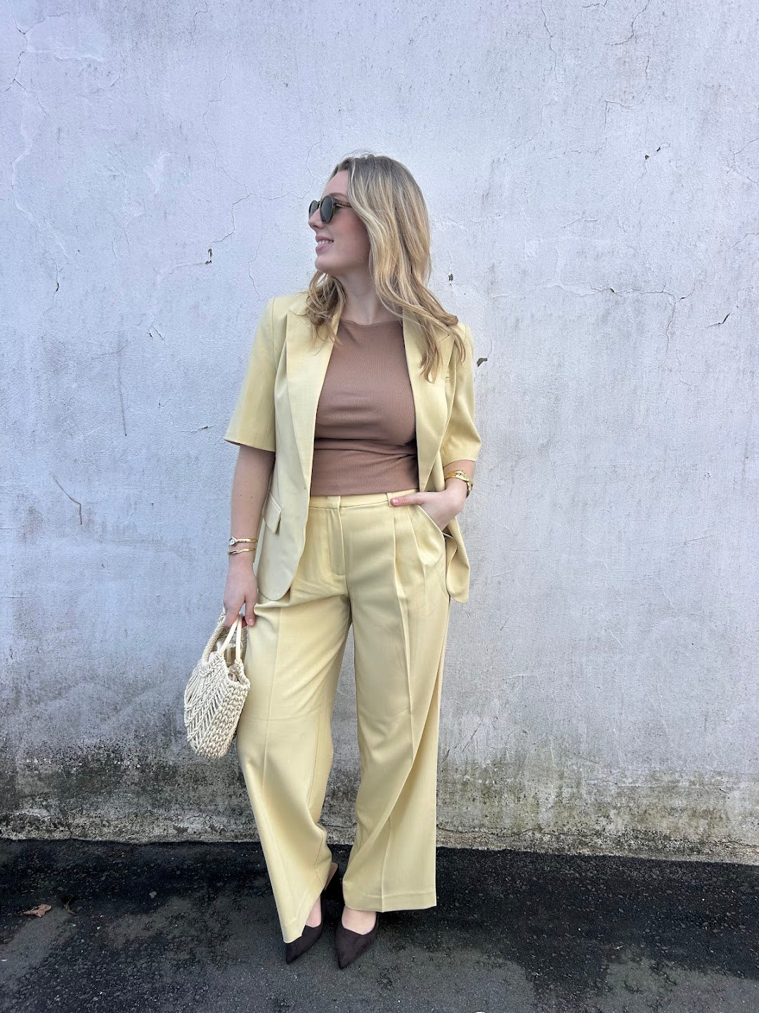 Blazer med korte ermer! Vi gleder oss til å bruke den i sommer! Den har en vid, rett passform. Du kan stille på størrelsen å få en mer innsvingt passform med knappene bak, som gir en kul detalj. Så kul i sett med Nilan buksene.