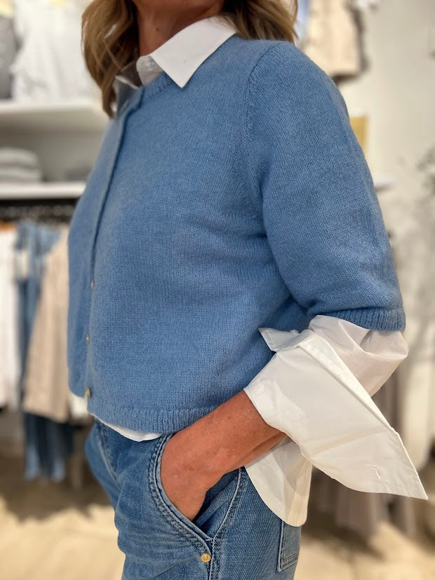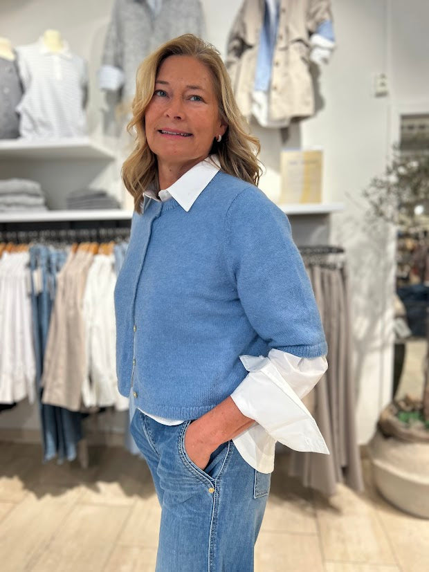 Herlig cardigan med halvlange ermer. Fin med en skjorte under, alene som en strikket topp, over kjoler osv. Den har full knappestolpe med pene knapper. Medium lengde og rett passform.