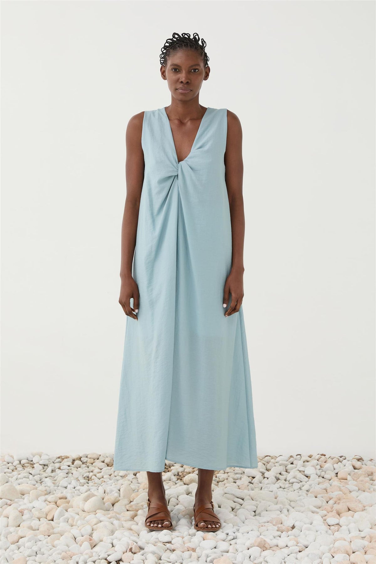 Enkel og nydelig sommerkjole med brede stropper og v-utringning med knytedetalje i front. Behagelig på de varme sommerdagene!