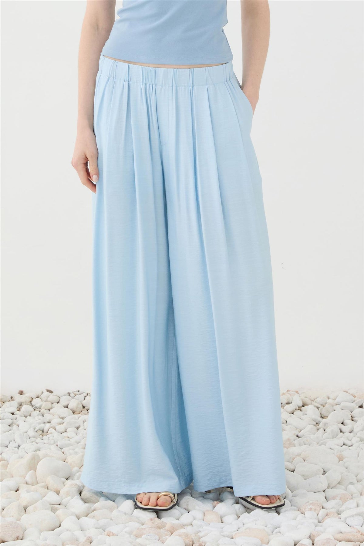 Bukse med strikk i livet som gjør den komfortabel å ha på. Den har vide ben og et fint fall. Buksen er fôret til låret, slik at den ikke er gjennomsiktig.