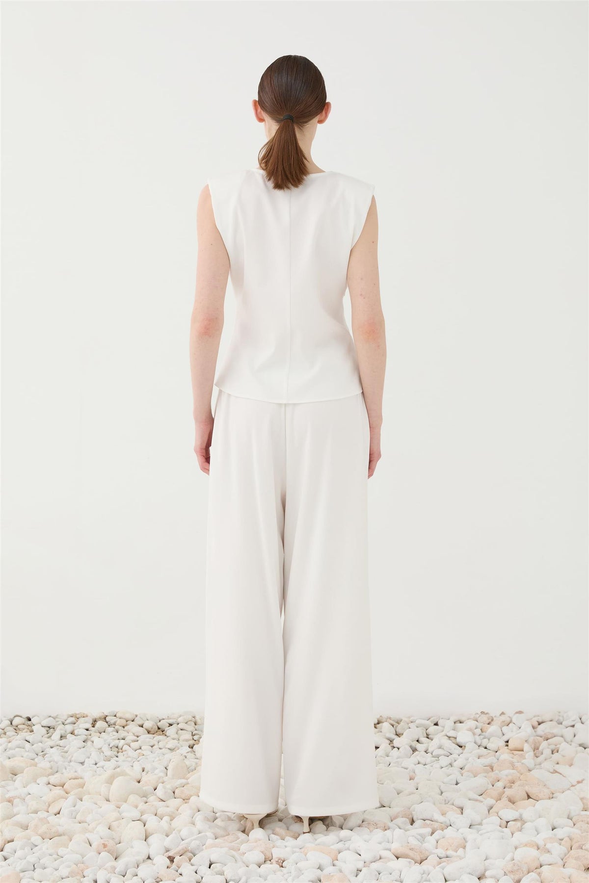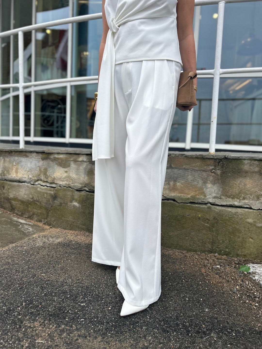 Lange vide bukser med legg i front. Så kul med matchende topp. Buksen har glidelås og knepping i front, og strikk bak som gjør den lett å tilpasse på størrelse. Behagelig å ha på! Perfekte sommersettet.