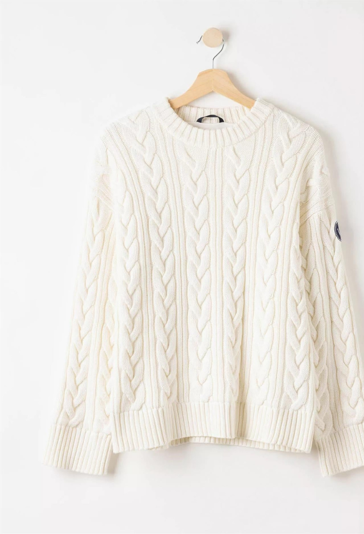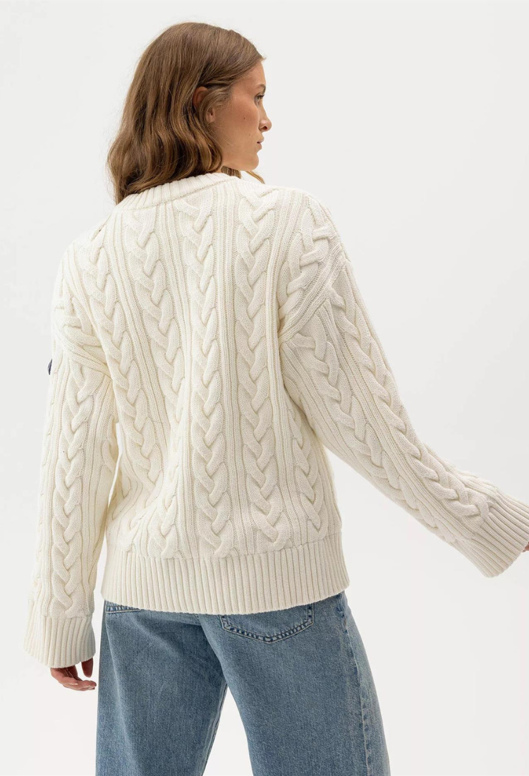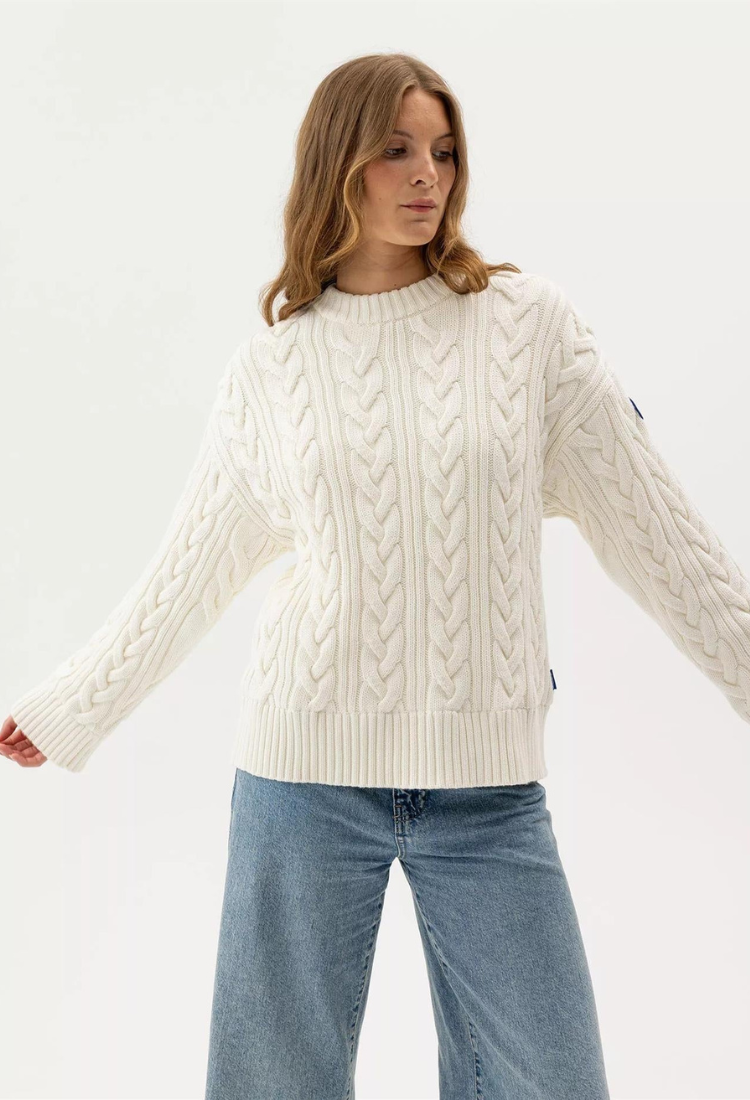 Vindtett kabelstrikket genser i økologisk bomull. Genseren har en avslappet passform med senkede skuldre og Ribbestrikkede mansjetter.