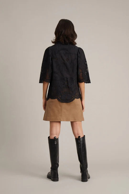 Søt blondebluse med 4/4 lange ermer, rund hals med en liten krage. Den har to delikate knapper i halsen. Den har en løs og ledig passform.
