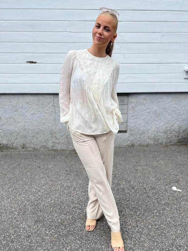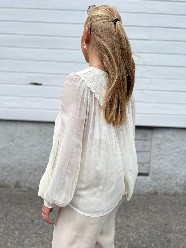 En lekker feminin bluse med løs passform, lange ermer og smukk detaljer på brystet og bak. Blusen har rund hals med knappelukking bak plassert bak. Den har også elastisk mansjett. Den er virkelig utrolig fin på og kan brukes året rundt.