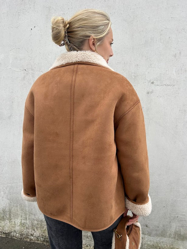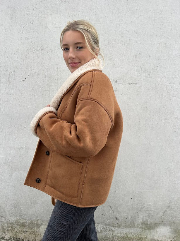 Utrolig kul jakke til høsten med retropreg. Assymetrisk knepping og to store lommer i front. Imitert saueskinn look.