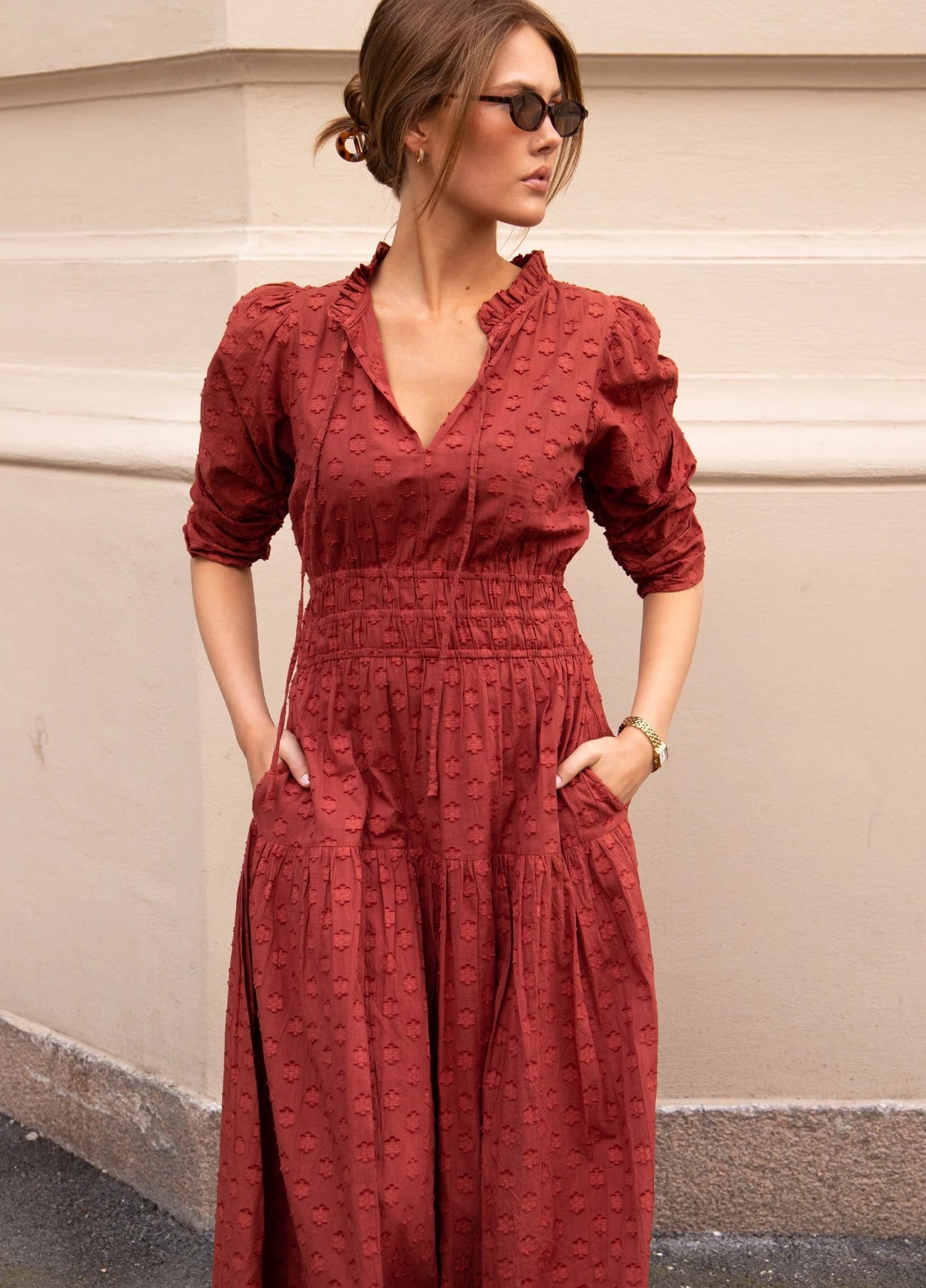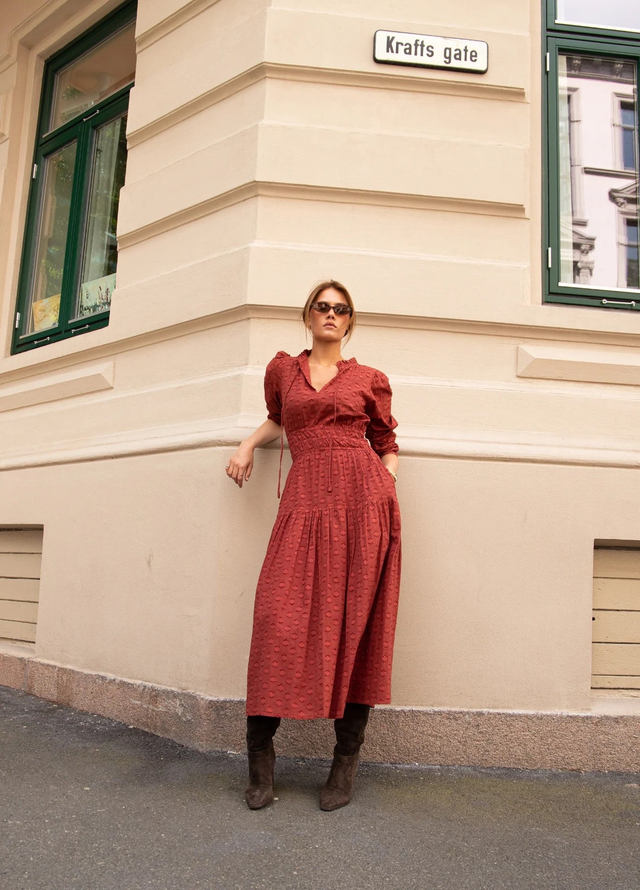 Gi garderoben din et løft med den elegante Madison-kjolen – en midikjole som kombinerer sofistikert stil med uanstrengt komfort. Kjolen er laget i lett og pustende bomull, og har en feminin v-hals, delikate puffermer og en elastisk midje som både sitter behagelig og fremhever figuren. Praktiske sidelommer gir et funksjonelt preg, mens det halvfôrede designet sørger for en behagelig passform. Normal i størrelsen – perfekt for både hverdagsbruk og finere anledninger.