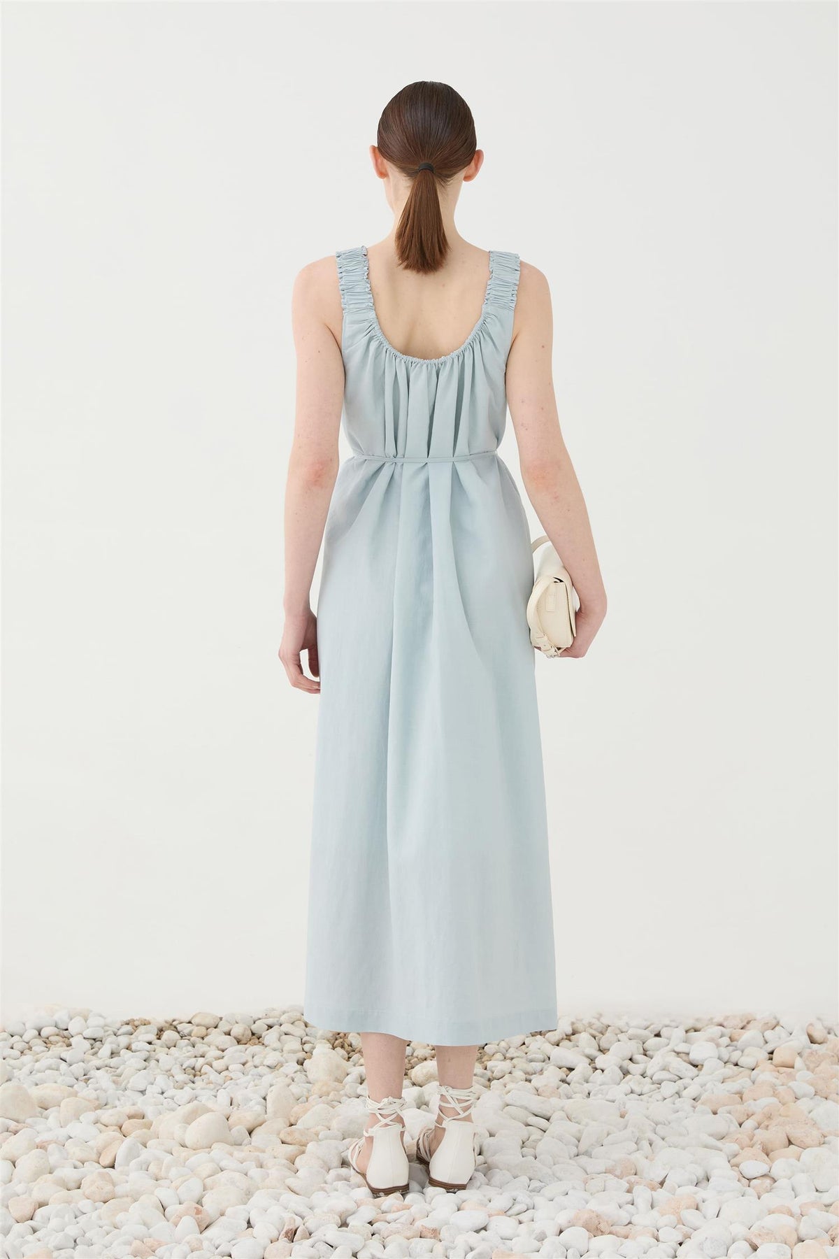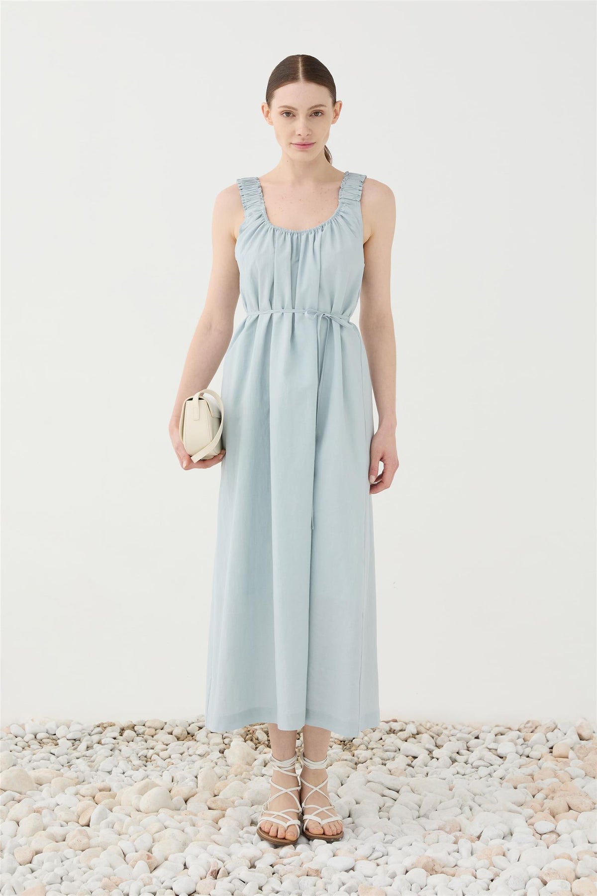 Nydelig sommerkjole med brede stropper og fine rynkedetaljer. Ved passform med knyting i livet. Avrundet utringning foran og bak. Midilengde. Svalt stoff som føles godt på varme dager.