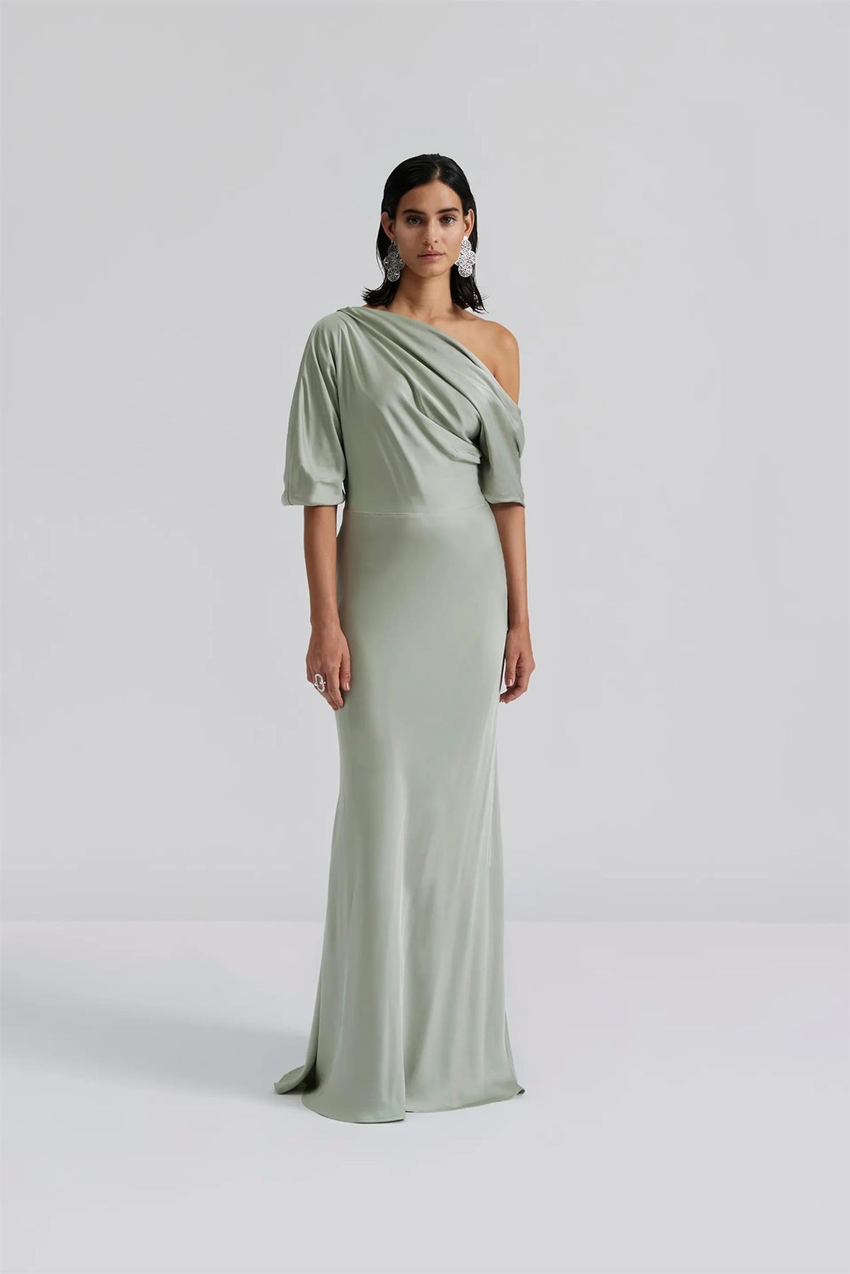 Elegant og vakker kjole til spesielle anledninger. Kjolen har en flatterende innsvingt silhuett, med stoff som faller fra hoftene og ned. Assymetrisk topp som er veldig trendy og løfter kjolen ekstra. Toppen har halvlange løse ermer med lekker drapering.
