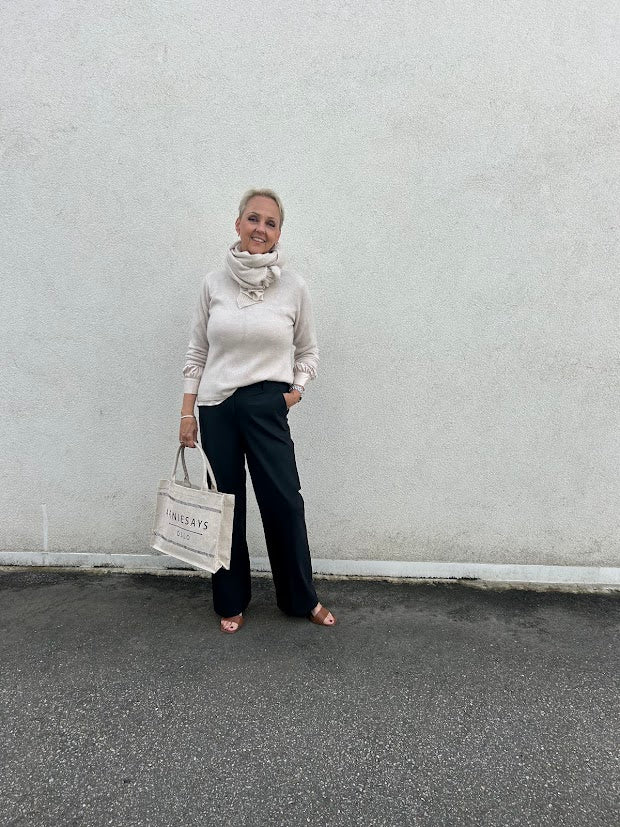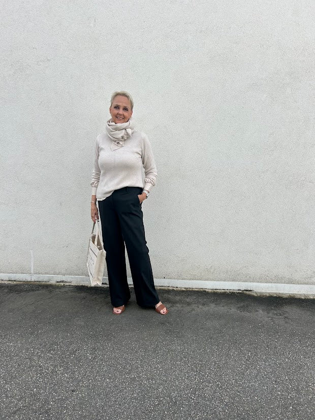 Utrolig stilige dressbukser med høy komfort, må prøves! En ny modell hos oss i år. Den har høyt liv og lange vide ben med oppbrett nederst. Skjult glidelås, stikklommer og beltehemper, en super klassiker.