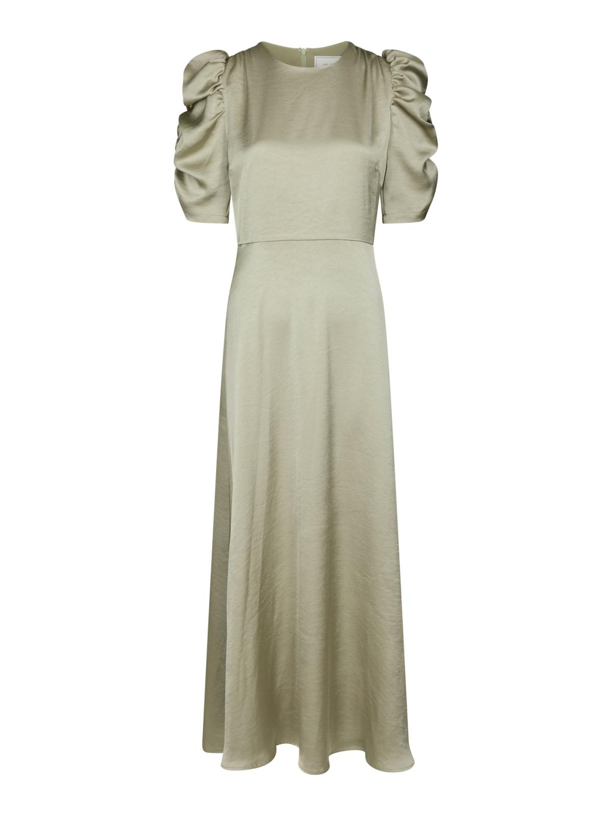 Elegant og feminin maxikjole med et sofistikert uttrykk. Kjolen har korte ermer med dekorativ rynkedetalj og lukkes med glidelås bak i nakken. Modellen er 176 cm høy og har på seg størrelse 36.