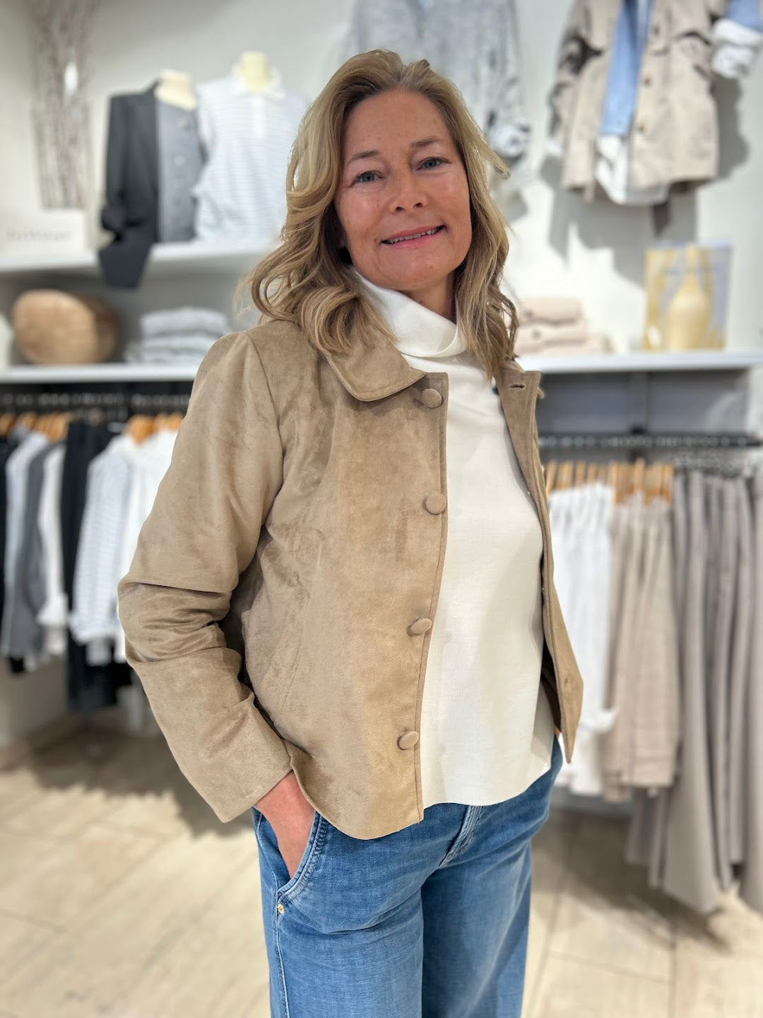 Jakke i semsket skinn look. Kul og nostalgisk og passer perfekt til høstens antrekk. Den har krage, trekte knapper, lange ermer og lommer i front.