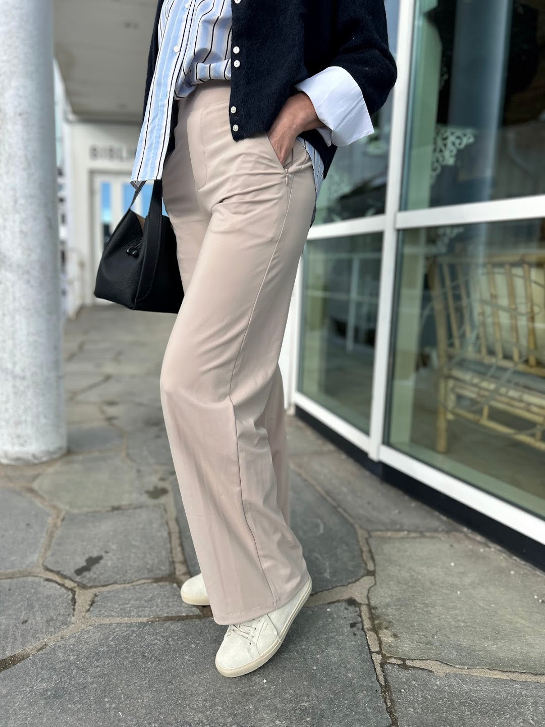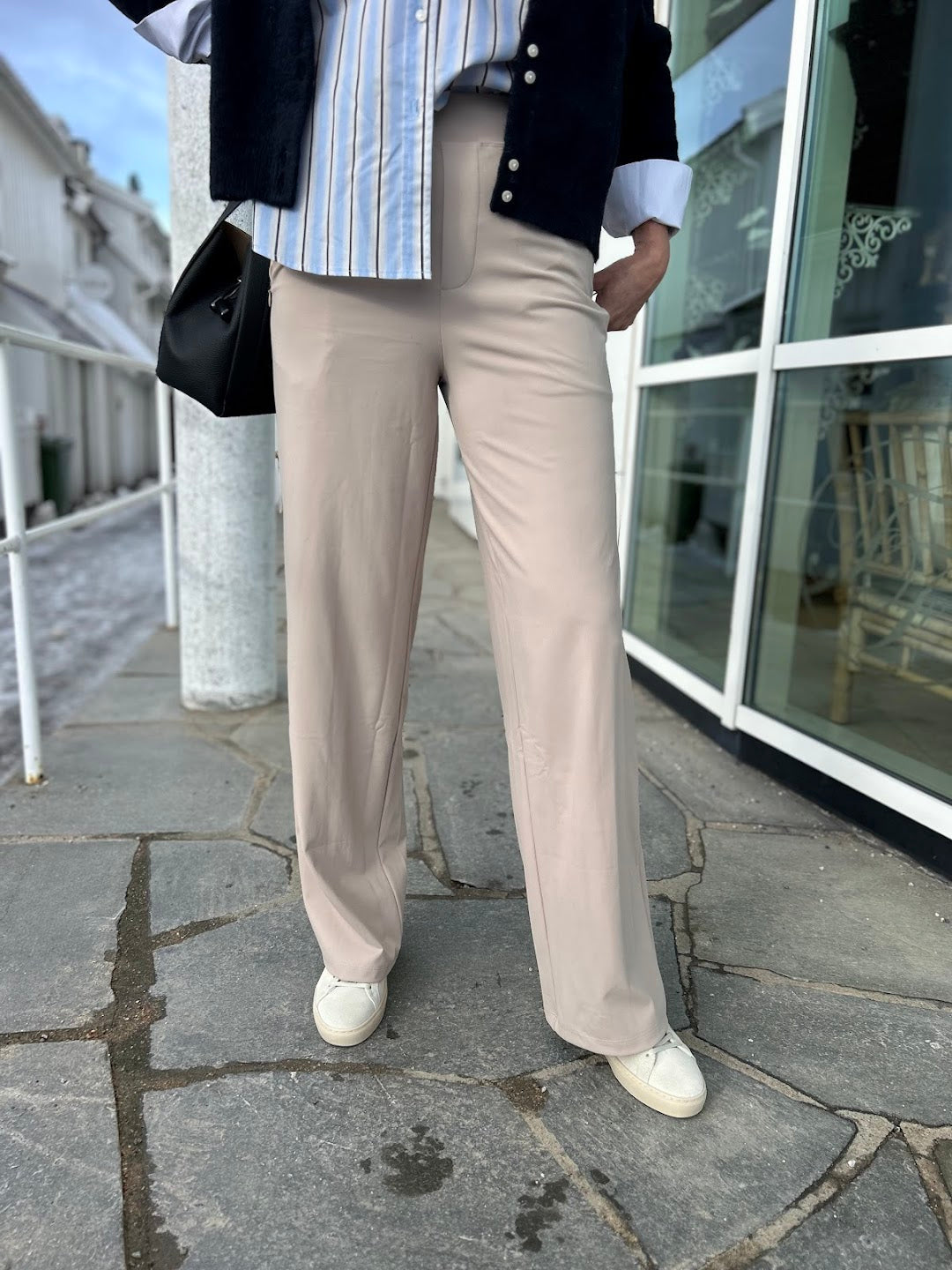 Endelig har vi Ninepine, buksene som tok internett med storm! Dette er komfortabelt work wear på sitt beste. Den ser ut som en dressbukse, men føles som en joggebukse! Perfekt for deg som ikke vil ofre komforten. Buksen har en bred strikk i livet, lommer og detaljer som gir dressbukse looken. Høyt liv og lange vide ben, kommer i 2 lengder.