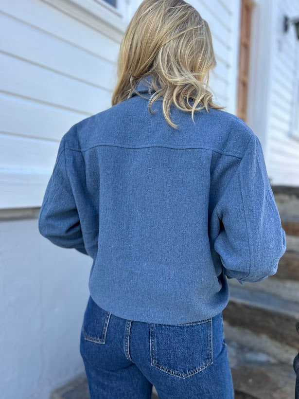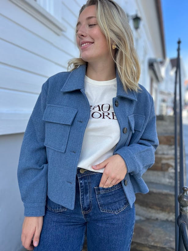 Skjortejakke til høsten i en nydelig blåfarge. Den har to store lommer i front, store kontrastknapper og lange ermer med knepping.