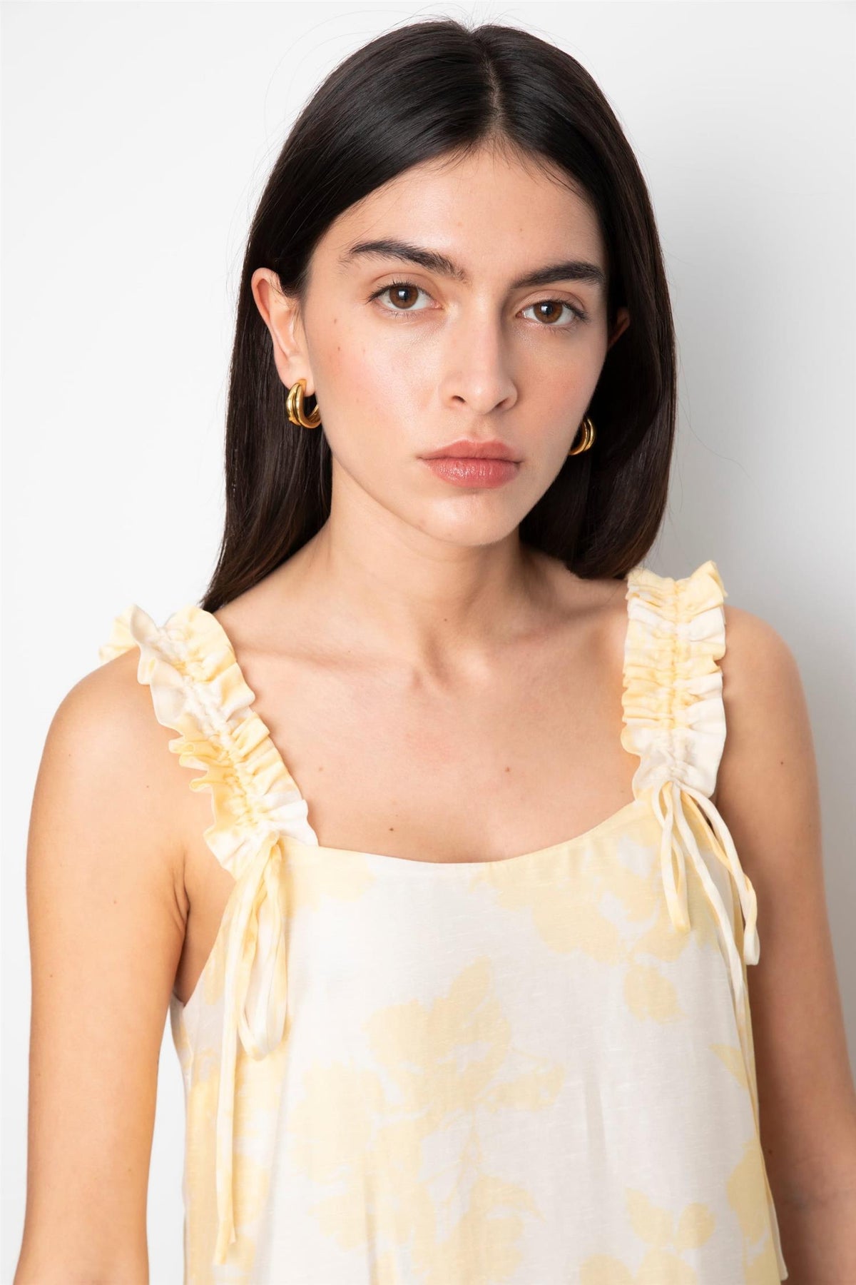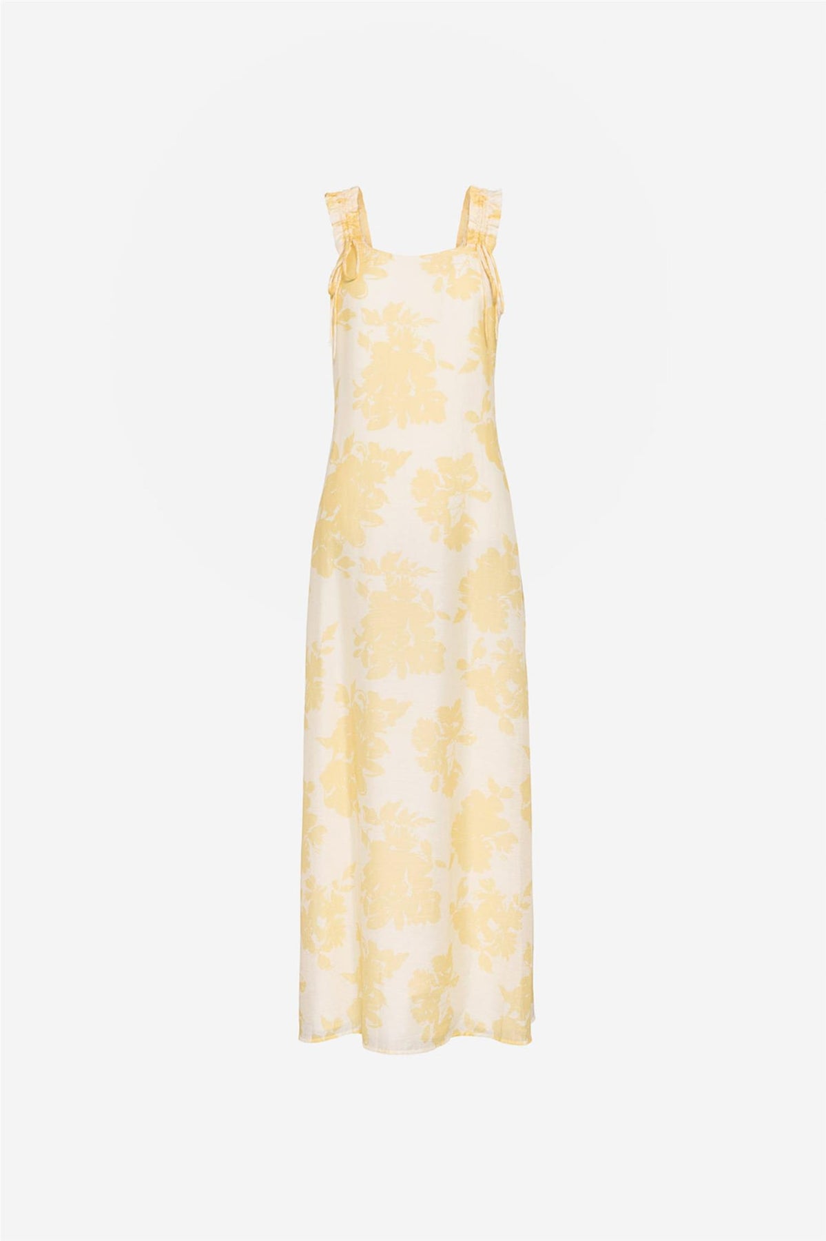 Nydelig kjole i delikat lysgult print. Kjolen har en vid og noe utsvingt passform. Brede justerbare stropper med fine rynke-detaljer. Perfekt til sommerens fine anledninger.
