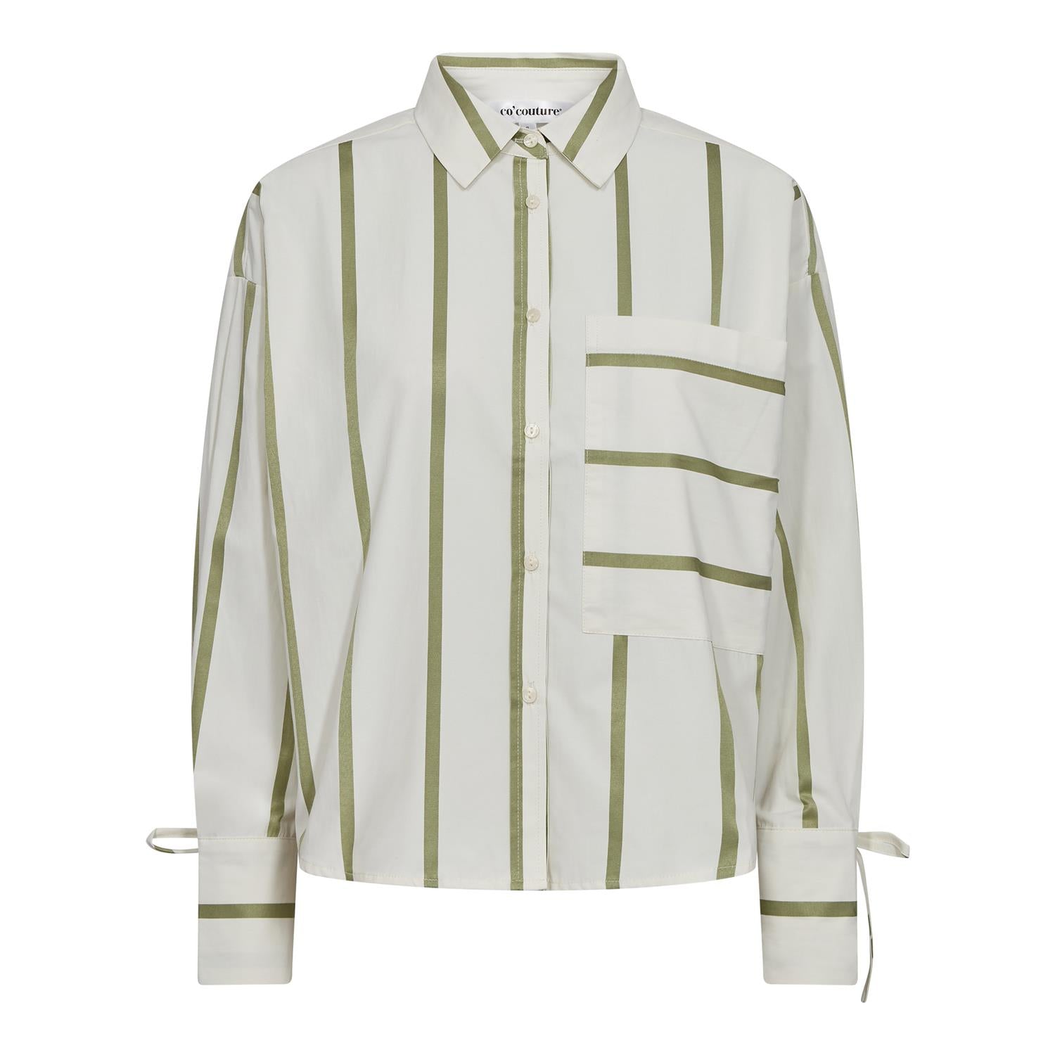 Så kul storskjorte med Co'couture vri. Rett, vid oversized fasong med rundt avskårede splitter. Lave skuldre, og ermer med knyting på mansjetten. Vertikale striper og stor lomme i front.