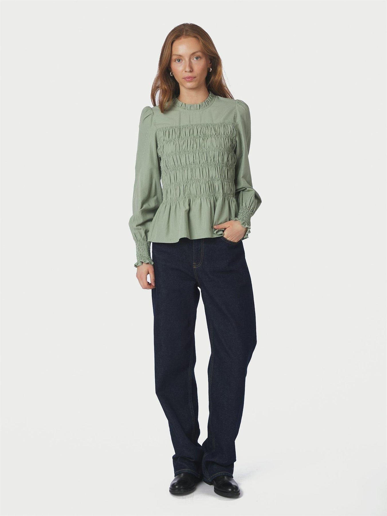 Søt langermet bluse med smock langs kroppen. Blusen har også smock på ermene. Kommer i en deilig dus grønnfarge.