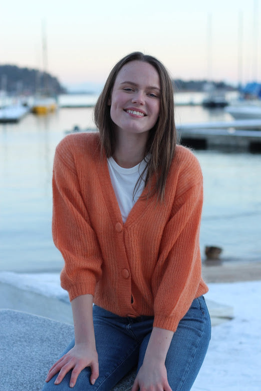 Cardigan fra Dear Dharma i ribbstrikk. Oversized snitt med v-hals og matchende knapper.