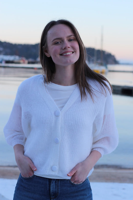 Cardigan fra Dear Dharma i ribbstrikk. Oversized snitt med v-hals og matchende knapper.