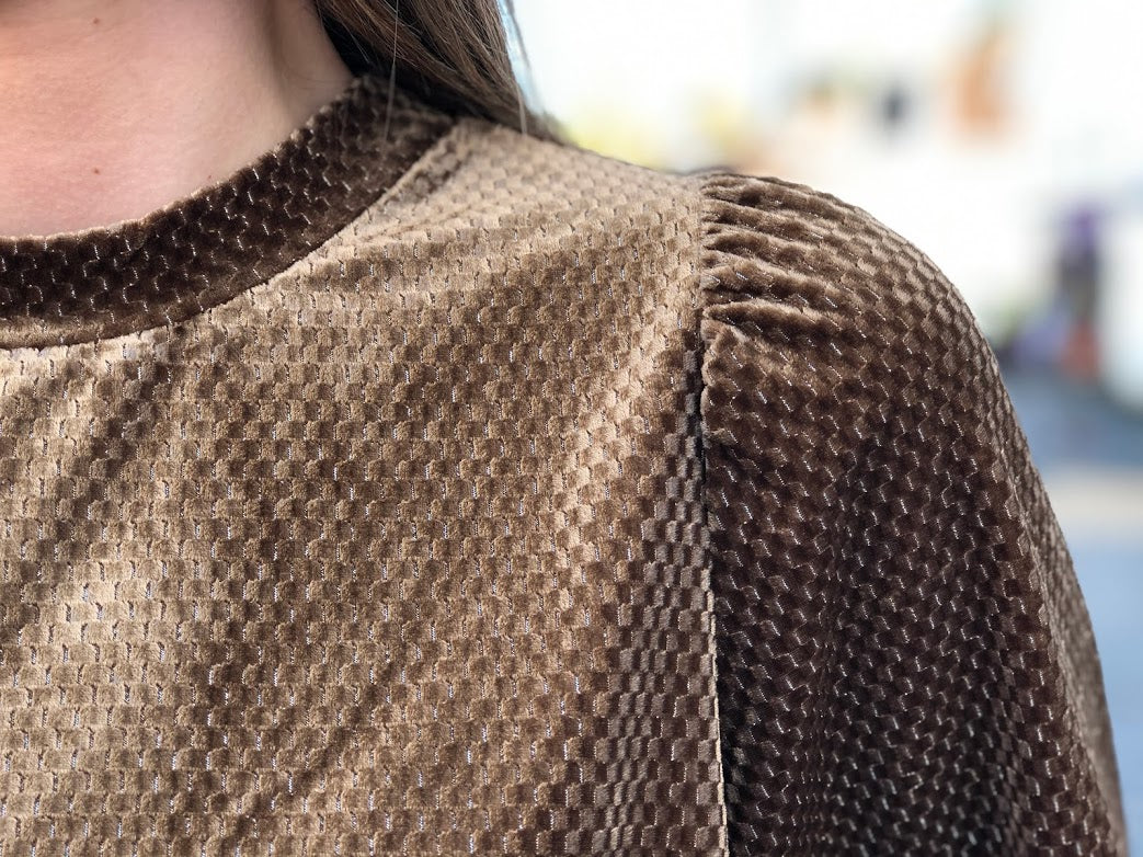 Genseren har litt volum-ermer og myk velurkvalitet. Den har et feminint snitt med litt "puff" på skulderen.