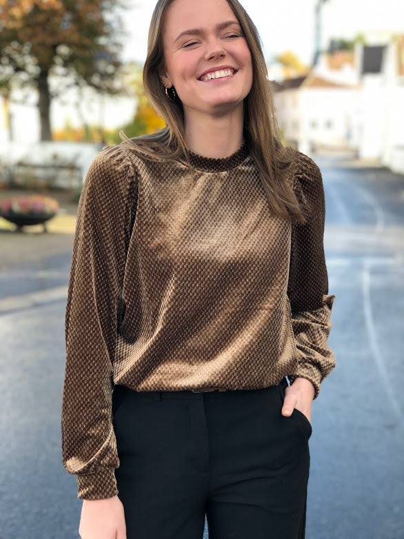 En supertøff genser/topp fra Second Female i en brun/metallic tone. Den kan du fint bruke med pen-bukser og høye hæler og til hverdagsantrekket.