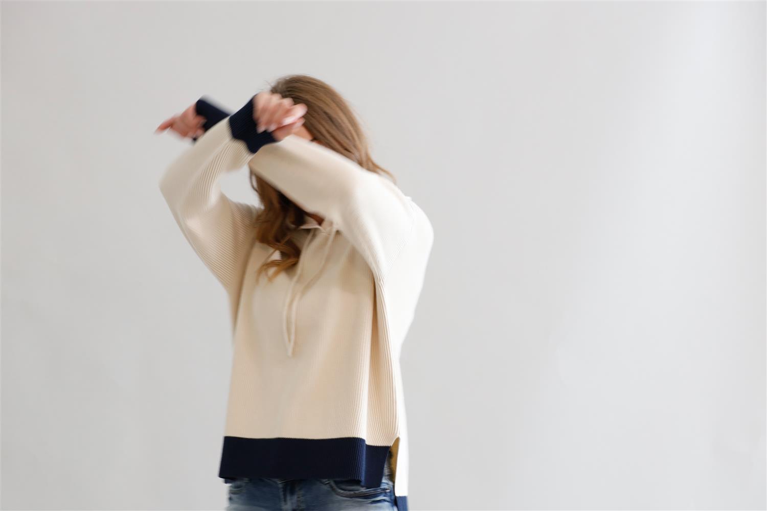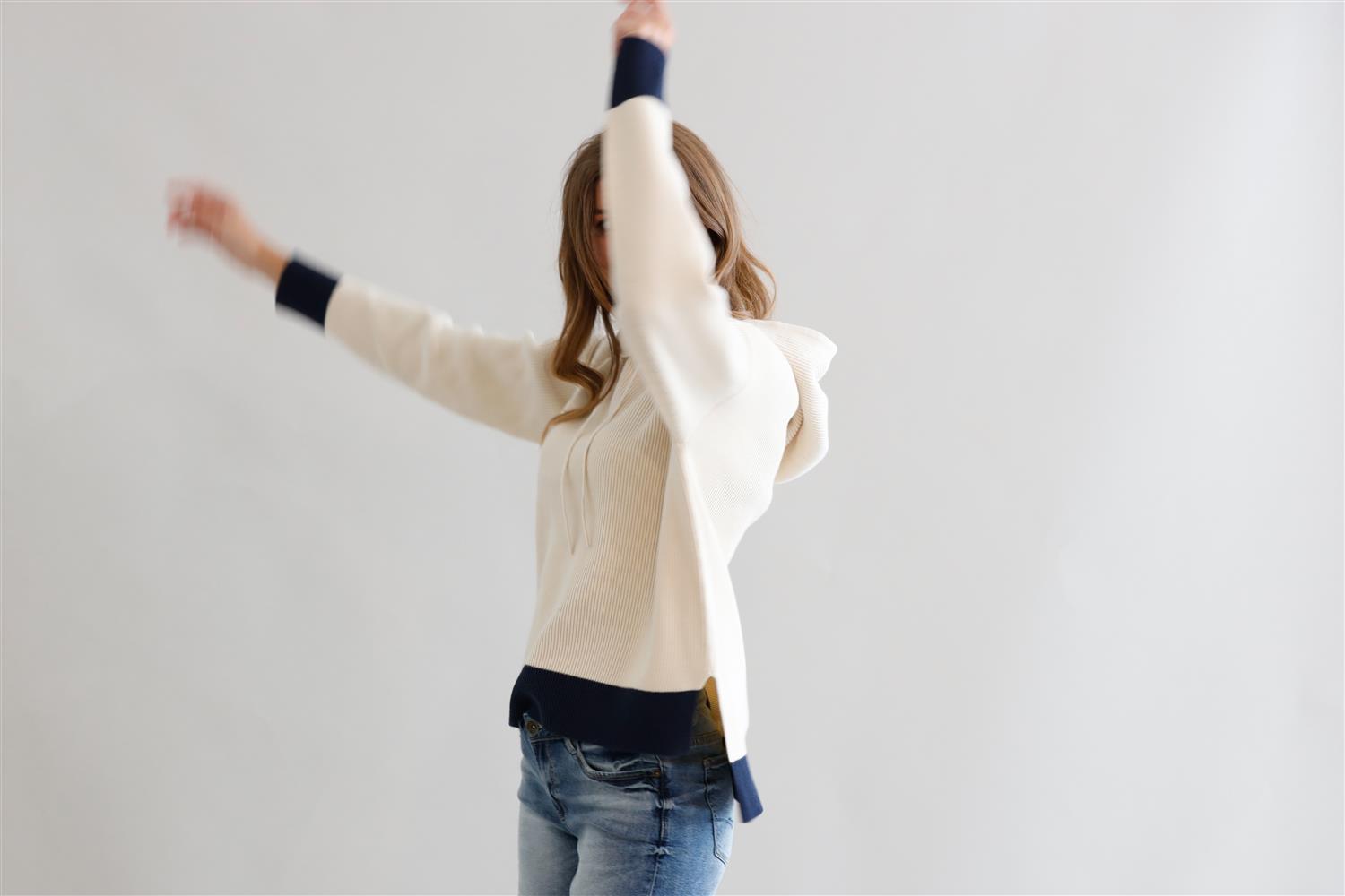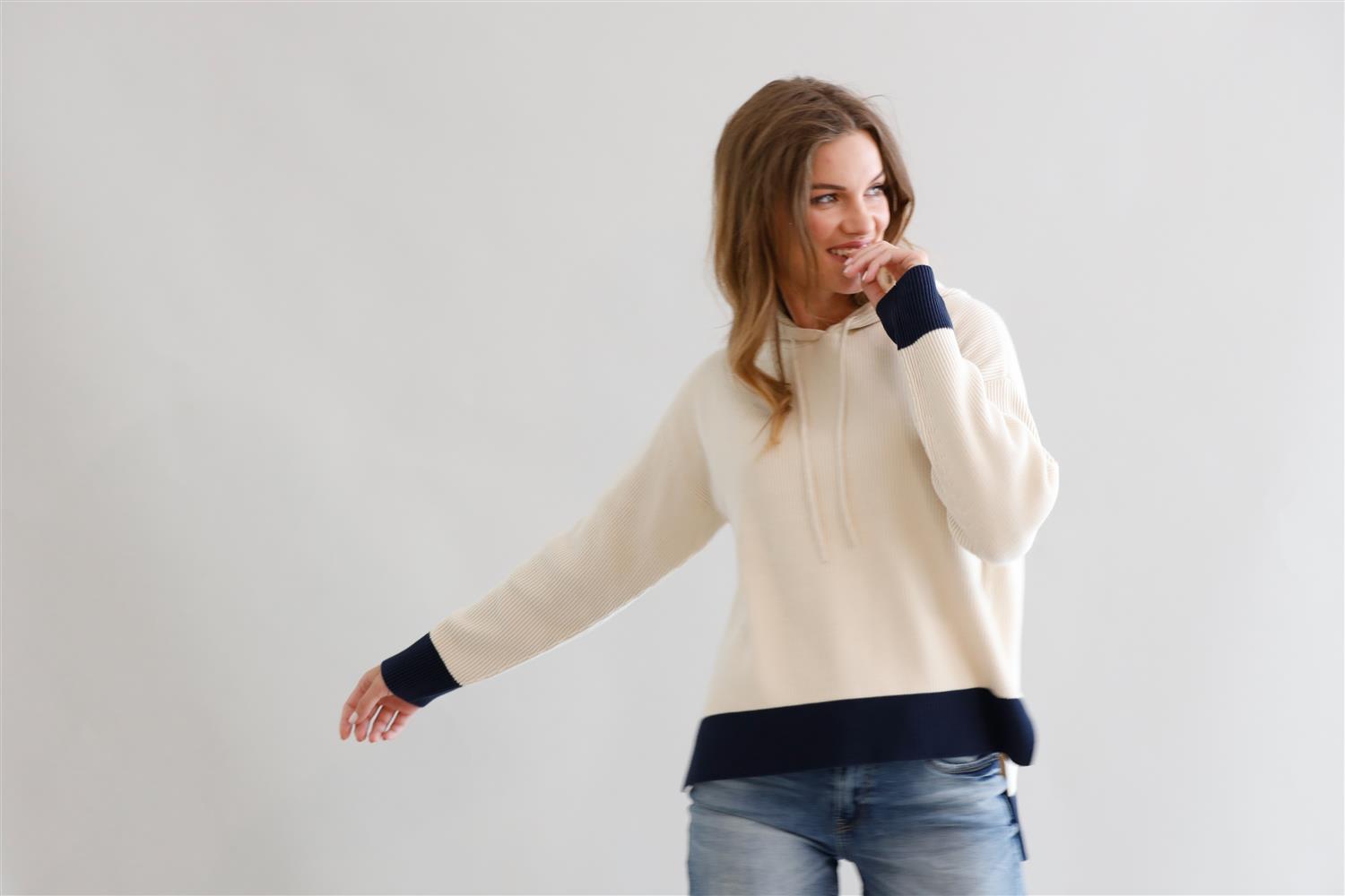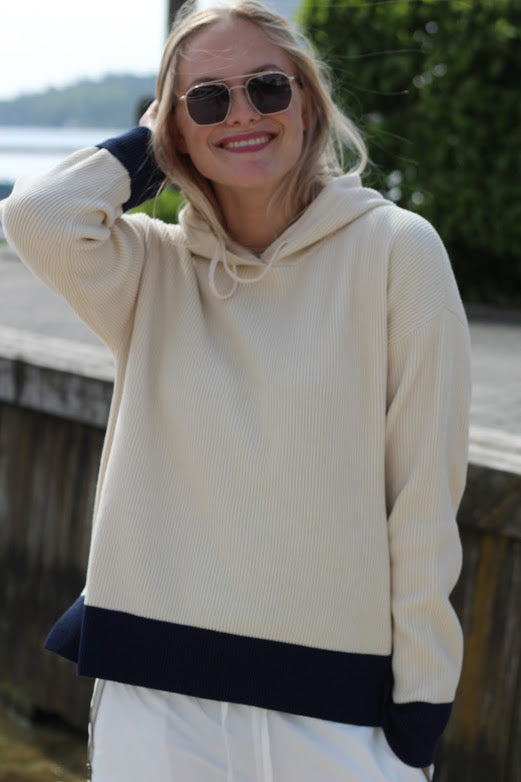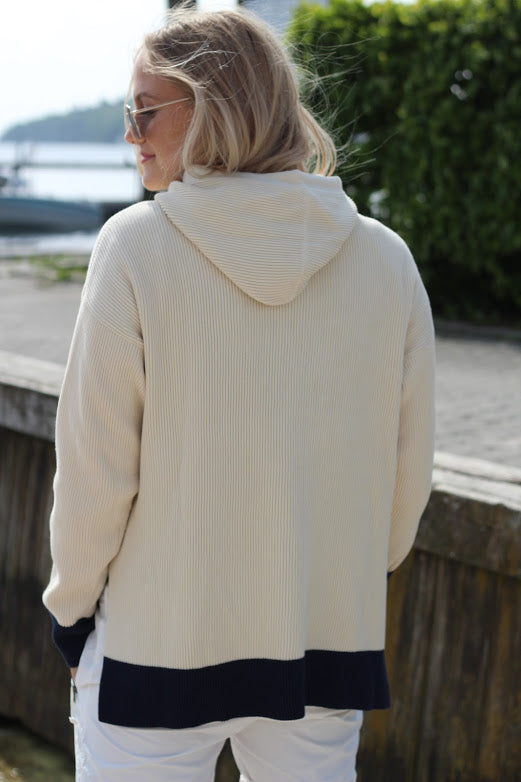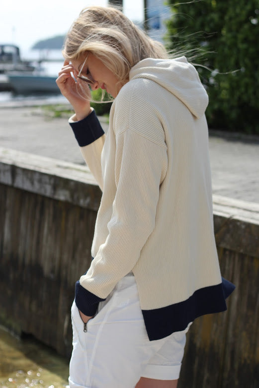 Strikkegenser fra Blue Sportswear med hette og snøring. Ribbestrikket med kontrast-stripe i bunn og på erme. Den har en stilig og sporty "look".
