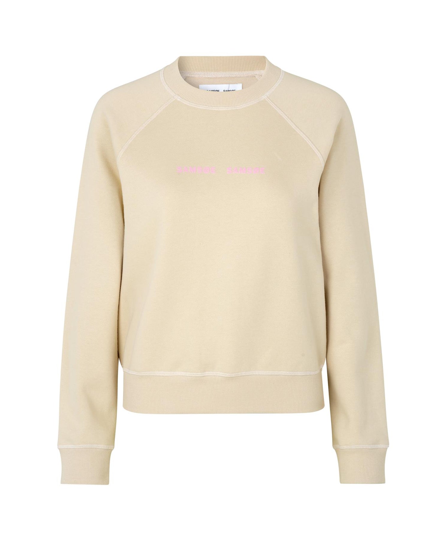 Myk, deilig collage genser fra Samsøe med logo på brystet.