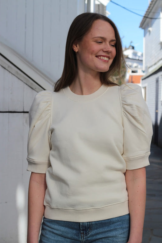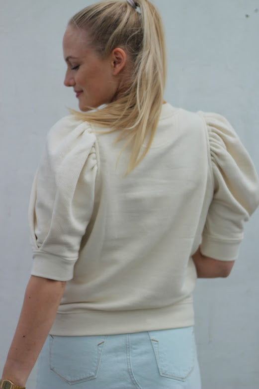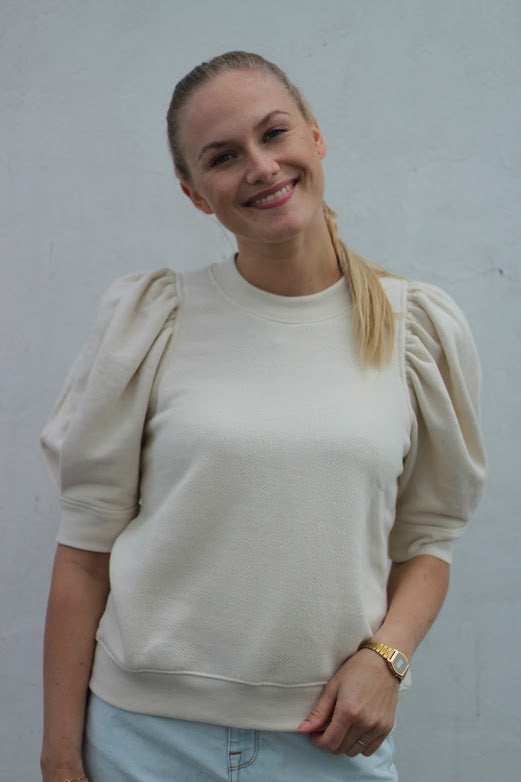 Toppen kommer i et mykt og behagelig college materiale i bomull. De store puffermene gjør hele toppen!
