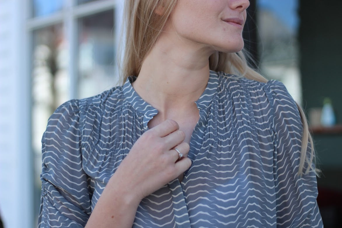 Blusen har v-halsutskjæring, korte ermer med smocking, og smocking detaljer ved skulderpartiet. Bølgemønster i grått og beige.
