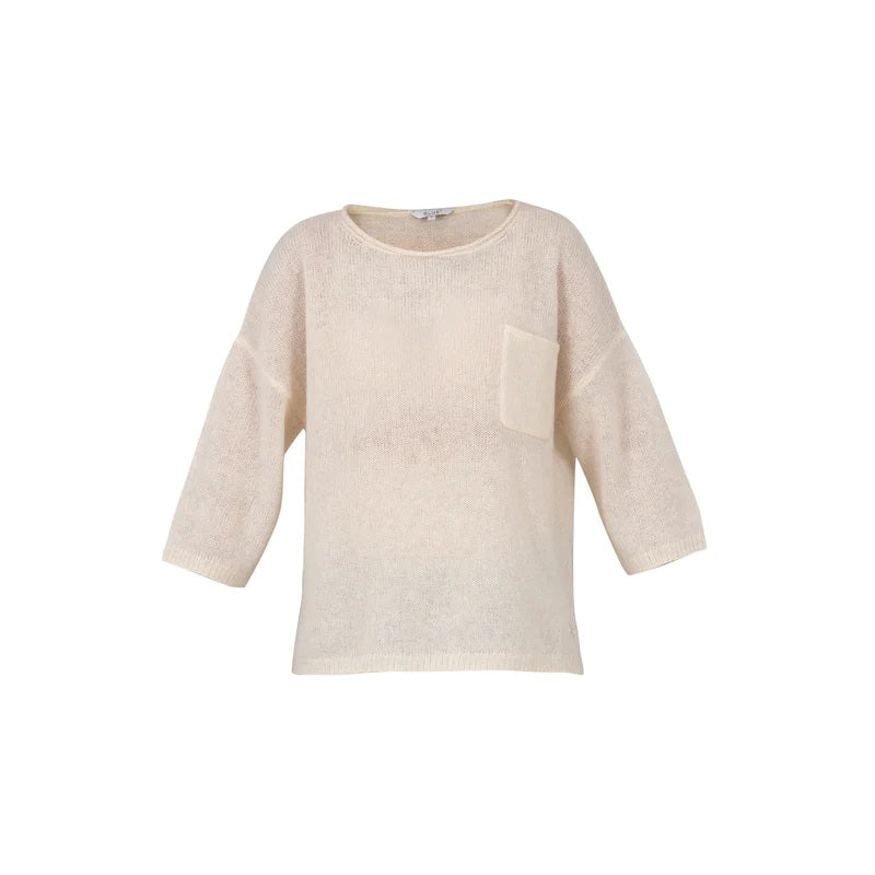 Herlig myk og lett mohairstrikk fra Blue Sportswear. Åpen og vid hals, avslappet passform med splitter i siden og trekvart lange ermer. Noe kortere lengde og dekorativ lomme i front.