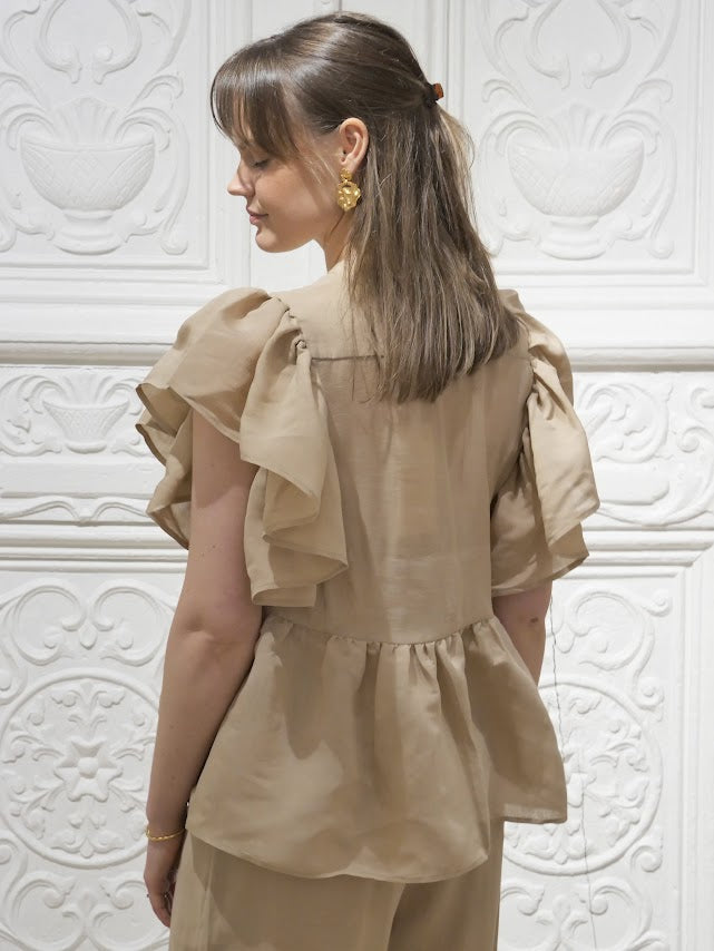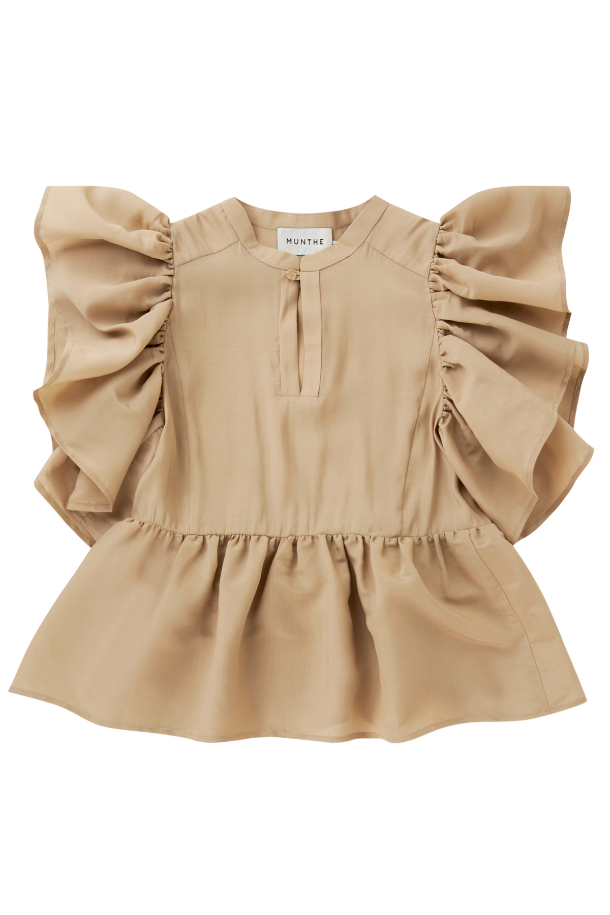 Topp fra Munthe som skiller seg ut i mengden. Feminint snitt og store volang detaljer, knepping i kragen. Kommer i en eksklusiv og lett kvalitet. Veldig fin med tilhørende bukse. God på størrelse.