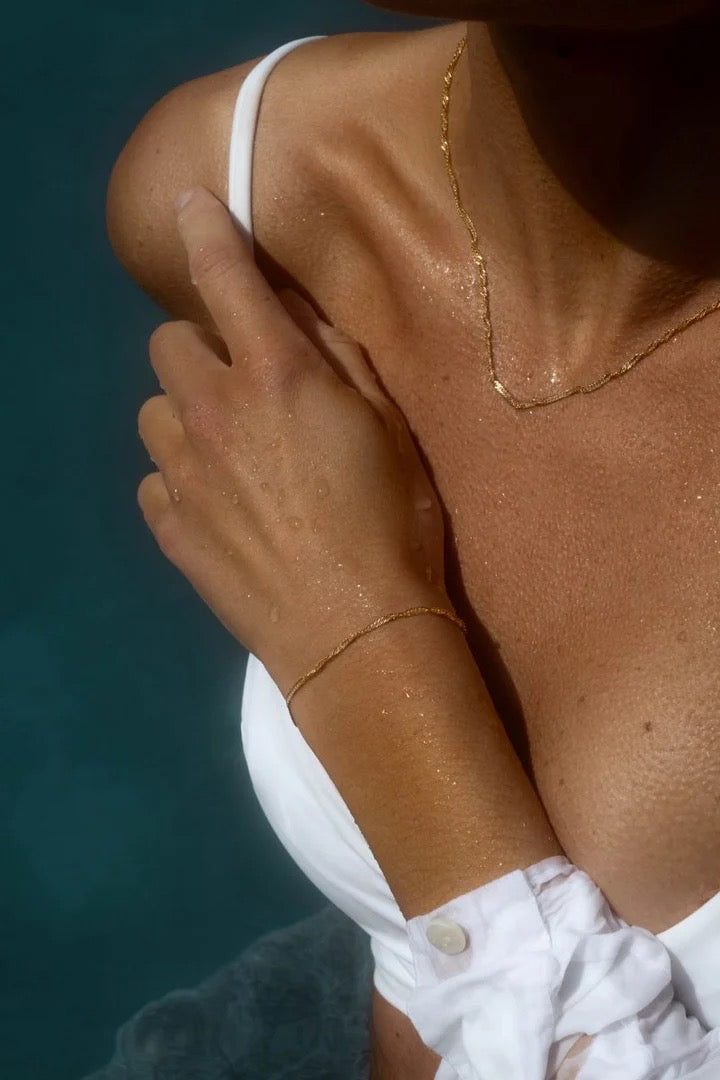 Alle smykkene i Mockberg sin Waterproof kolleksjon er laget av massivt rustfritt stål med 18K Gull PVD-Belegg. Dette gjør smykkene meget motstandsdyktige mot vann, riper og slitasje.