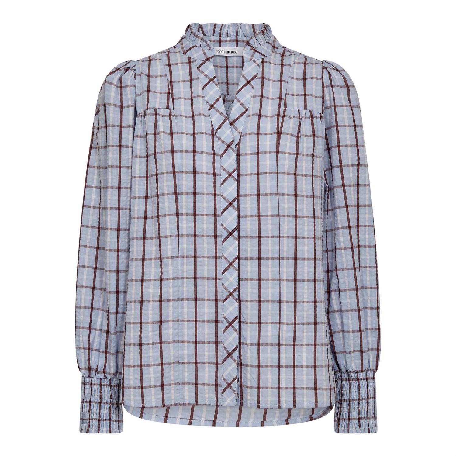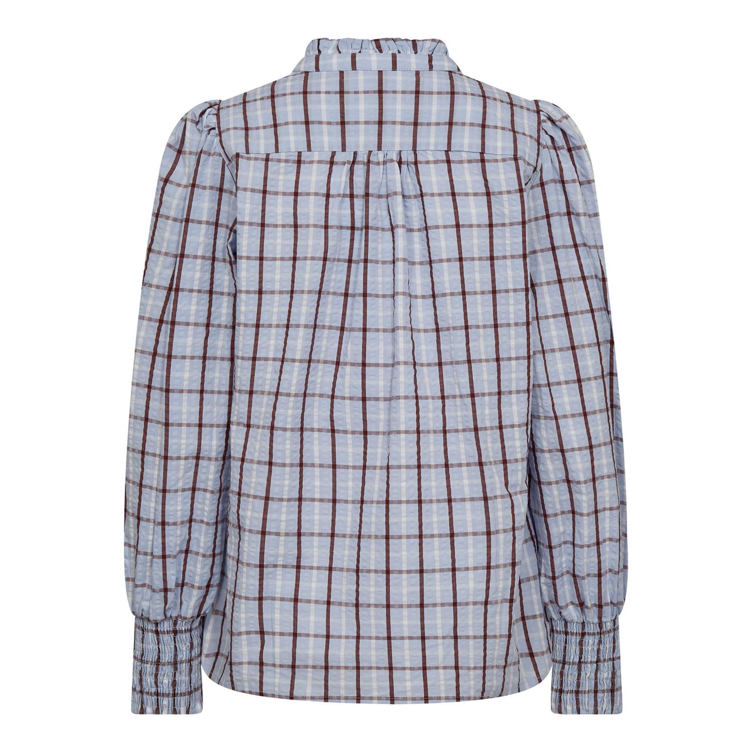 En herlig bluse til hverdags i kreppet bomull med rutemønster. Den har full knappestolpe, feminine ermer med litt puff og smoking mansjett. Ruffles rundt kragen.