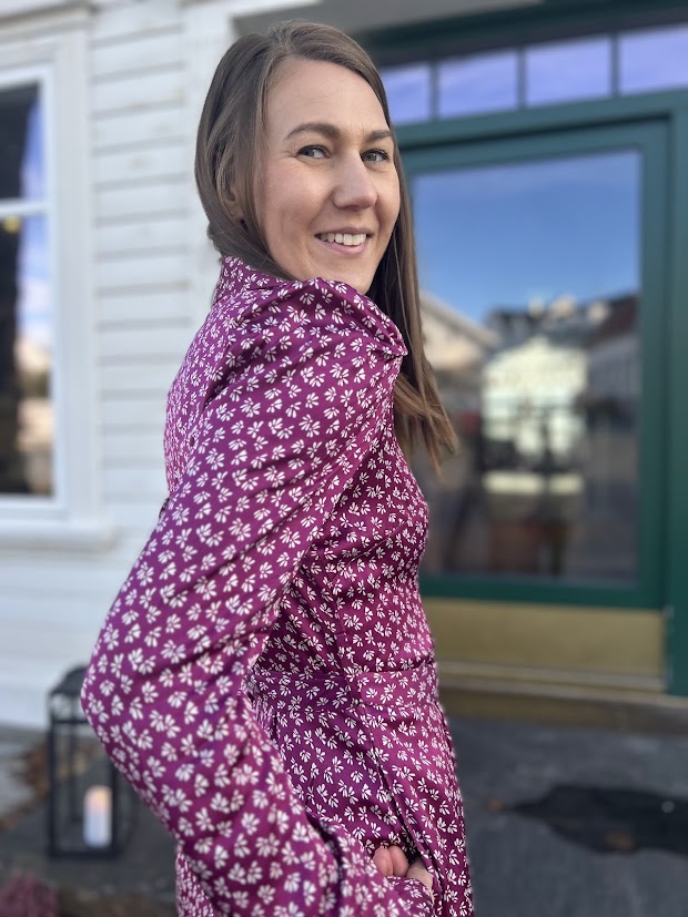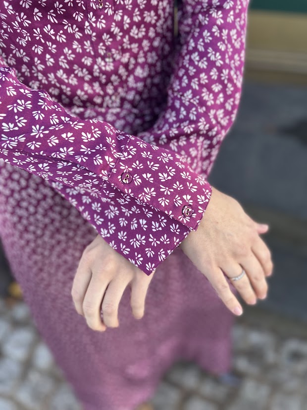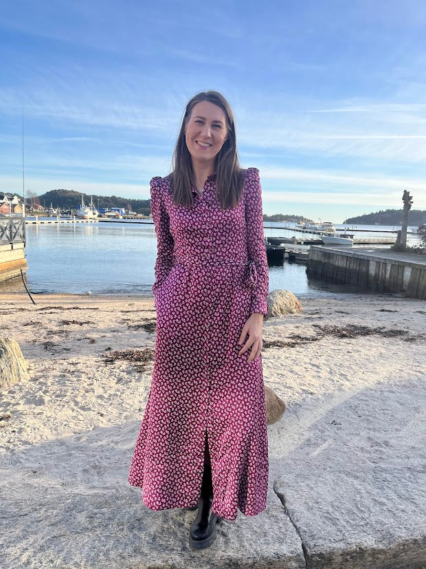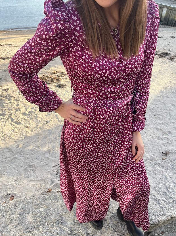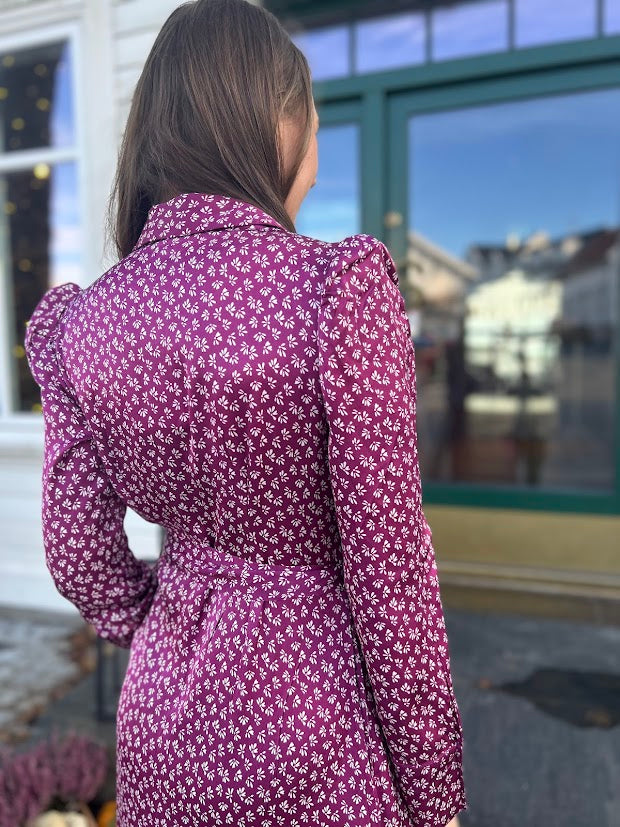 En tidløs og elegant kjole. Den feminine fasongen fremheves av en klassisk krage, knapper langs hele kjolen og en markert midje med et avtagbart belte som skaper en vakker silhuett. De lange ermene har subtile puffdetaljer ved skuldrene, og det florale mønsteret gir kjolen et sofistikert, men samtidig romantisk preg – like velegnet til hverdagsbruk som til festlige anledninger.