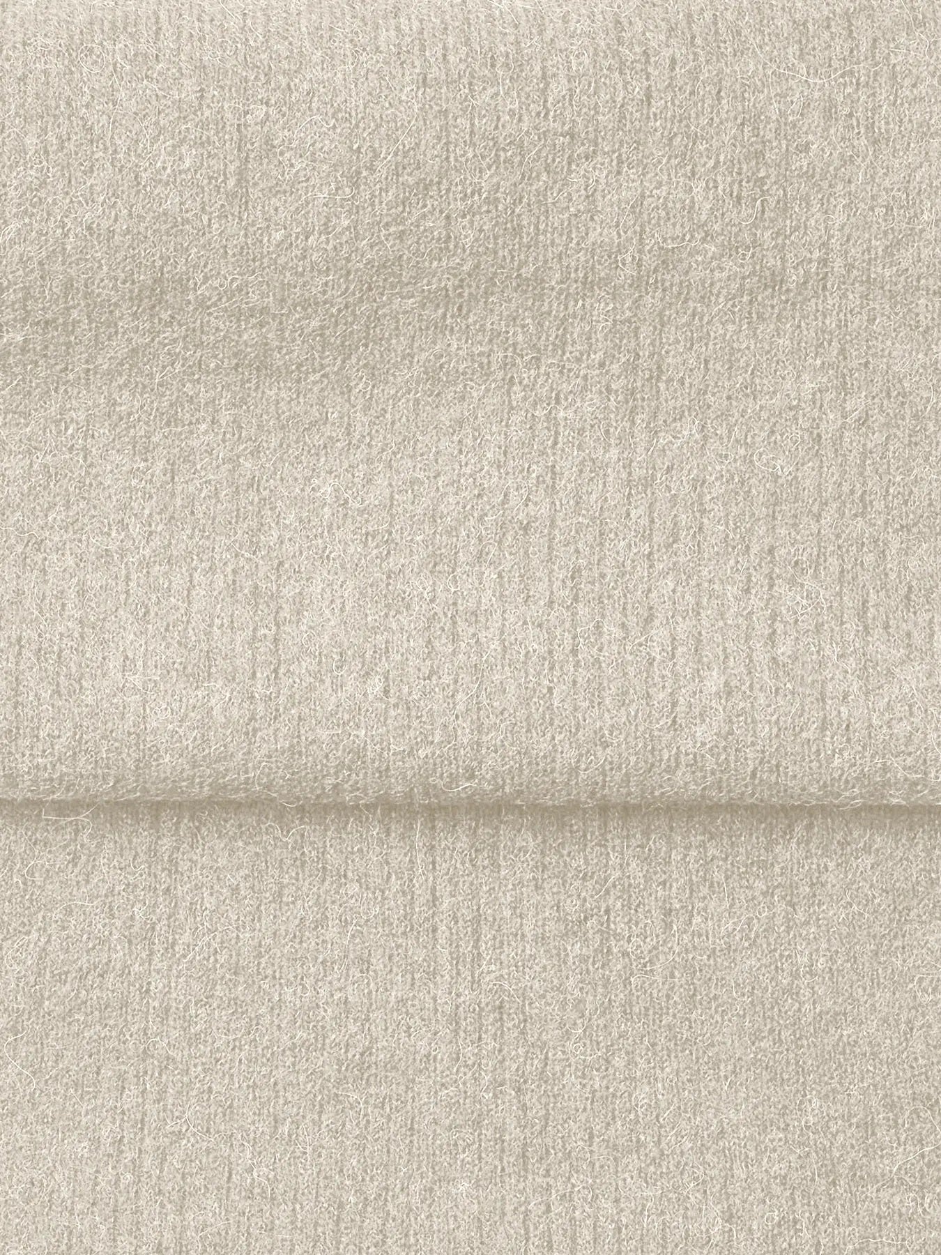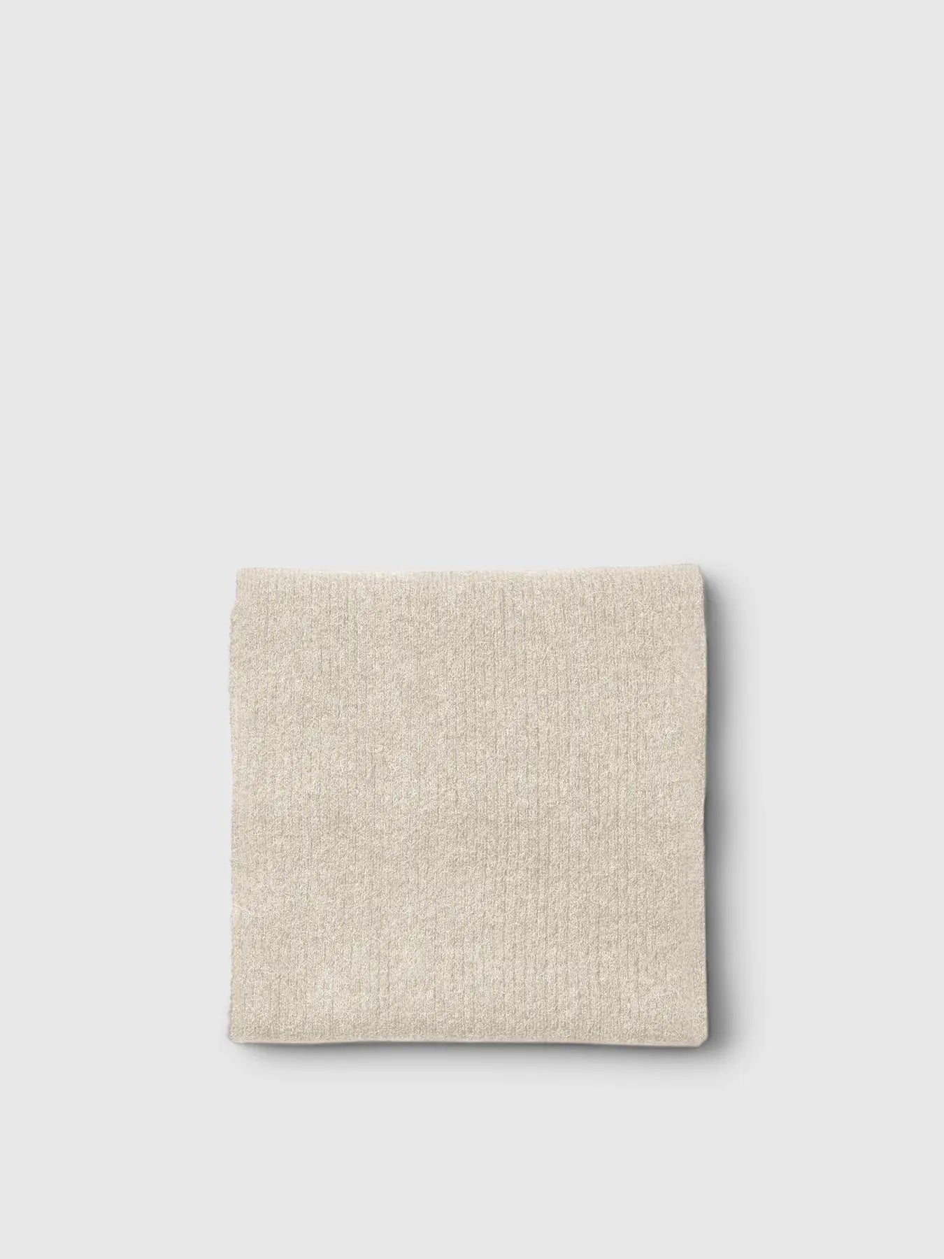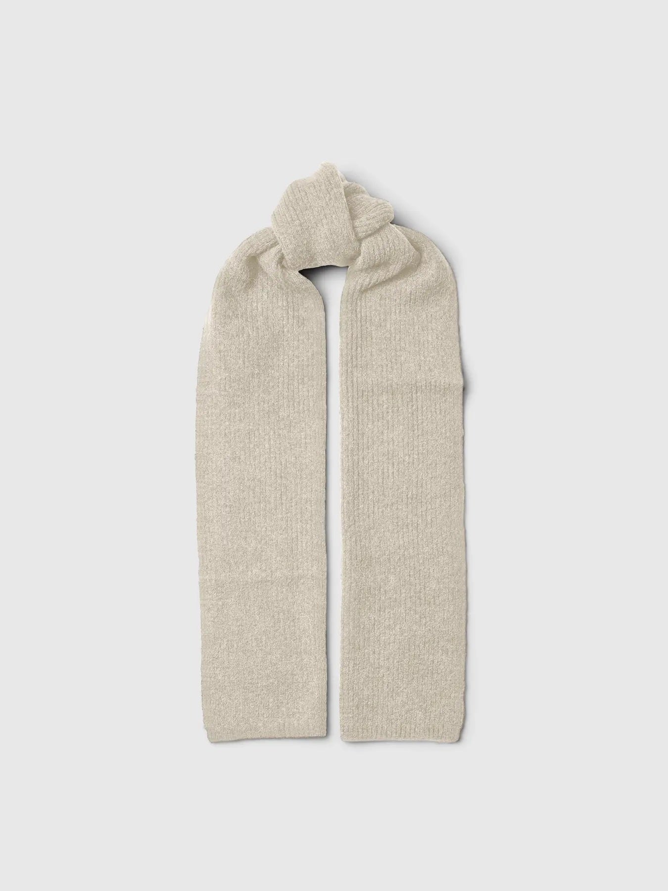 Et skjerf som kombinerer varme og eleganse. Den myke ribbestrikken, med innslag av ull og alpakka, gir et tidløst uttrykk og gjør skjerfet enkelt å style både rundt halsen og over skuldrene. Med god lengde og bredde er det perfekt å pakke seg inn i på kjølige dager – like fint til hverdags som til mer pyntede antrekk.