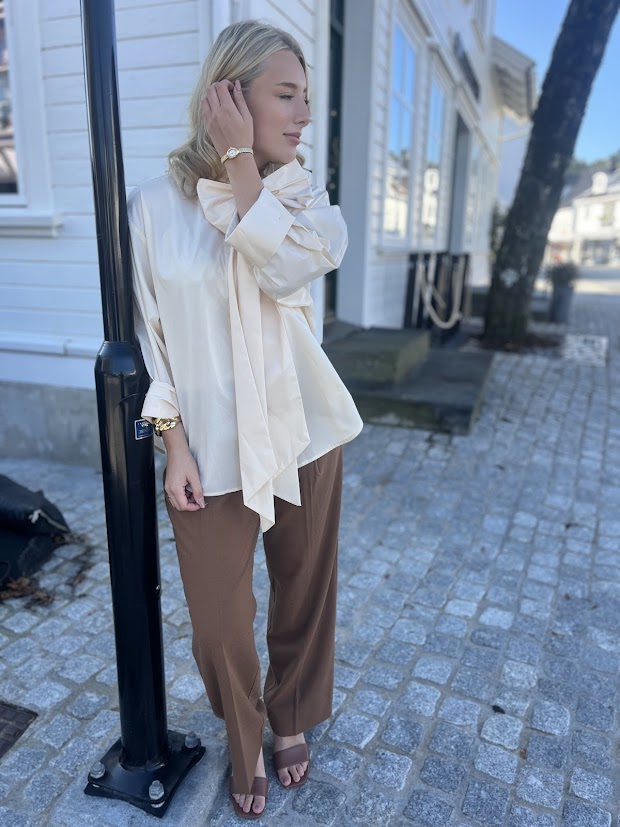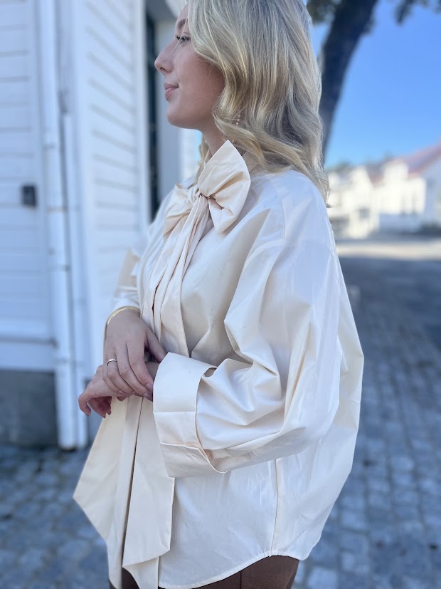 Kremfarget skjorte med oversized passform og en markant sløyfe i halsen. Den kombinerer klassiske detaljer med et feminint og elegant uttrykk – perfekt til både hverdag og fest.