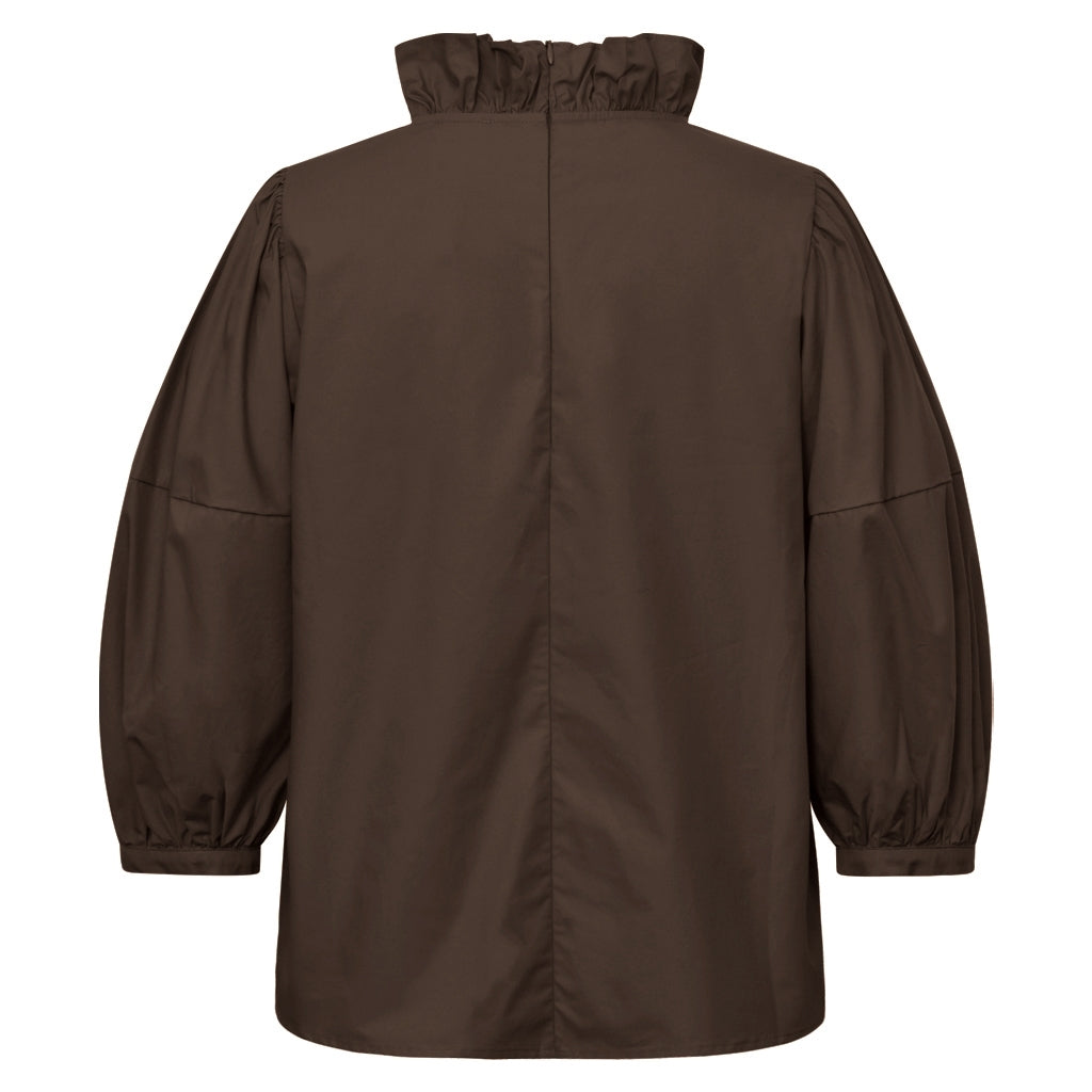 Blusen er laget av 100 % myk bomull og har en høy, dekorativ krage med rysjer som gir den et unikt uttrykk. Volanger langs ermene tilfører et feminint preg, mens den løse passformen gir et behagelig og uanstrengt stiluttrykk.