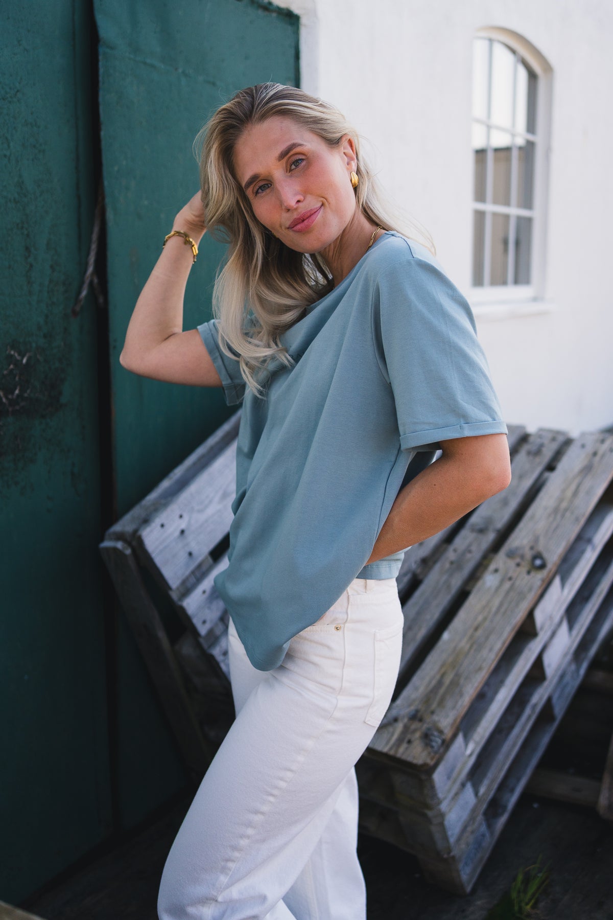 T-skjorte med et tidløst uttrykk, rett passform, korte ermer og rund hals. Den er laget i 100 % bomull, noe som gjør den lett, myk og behagelig mot huden. En diskret logo på brystet gir en subtil detalj. Style den med jeans og sneakers for et komfortabelt og avslappet hverdagsantrekk.