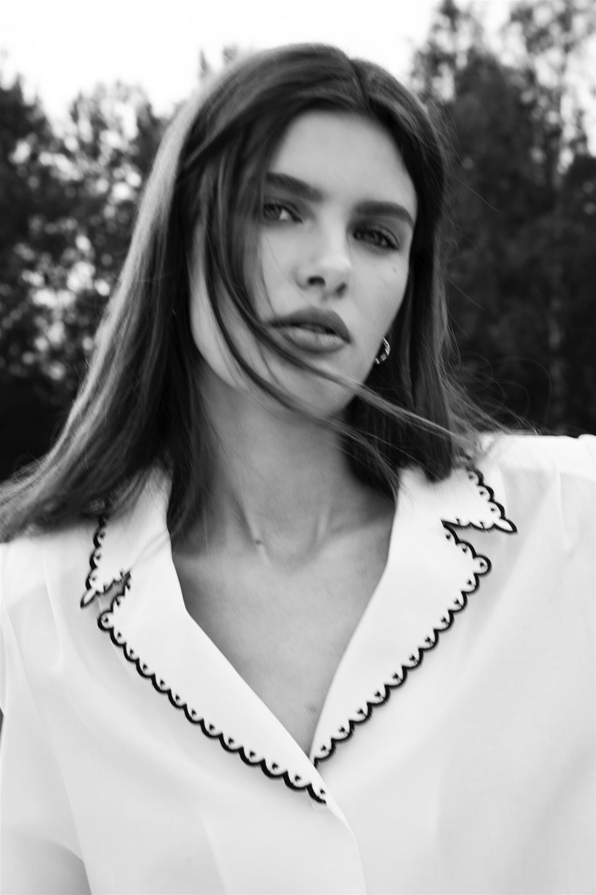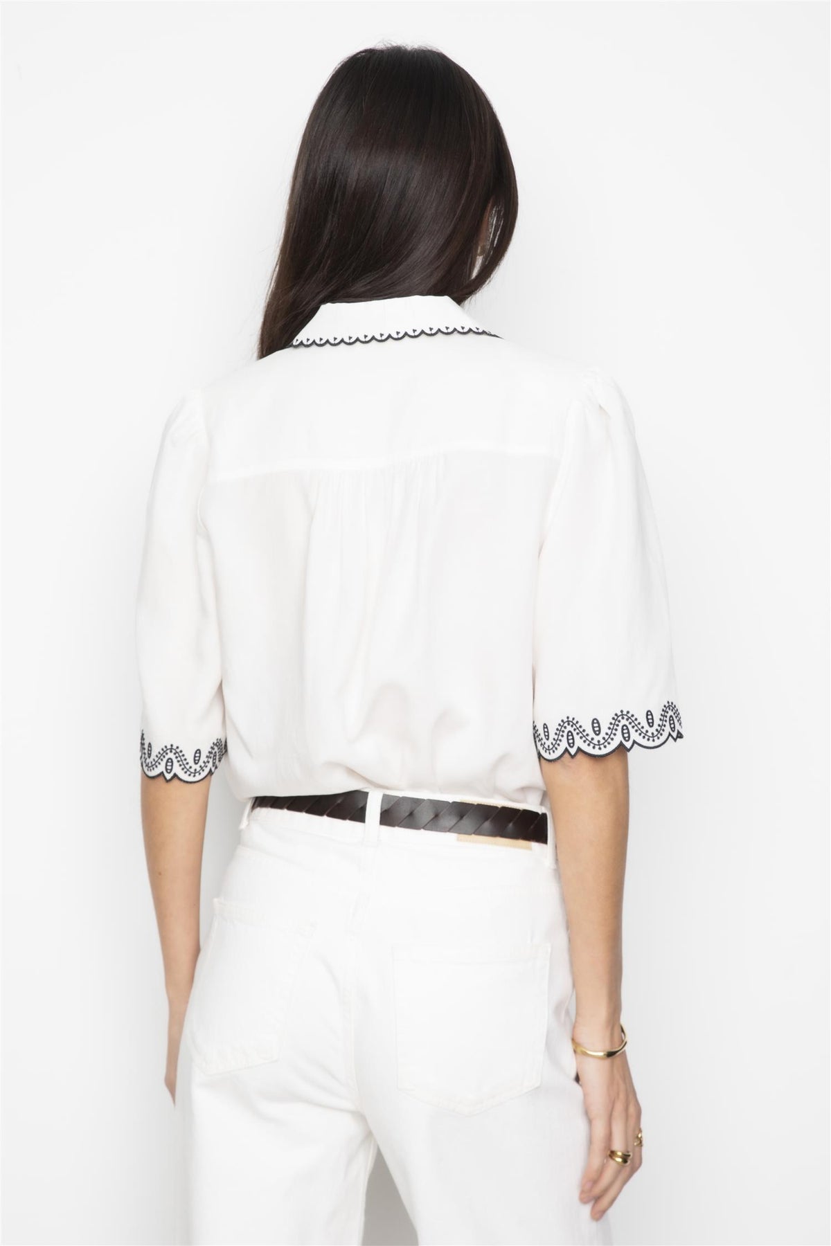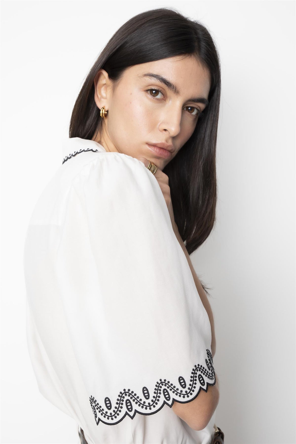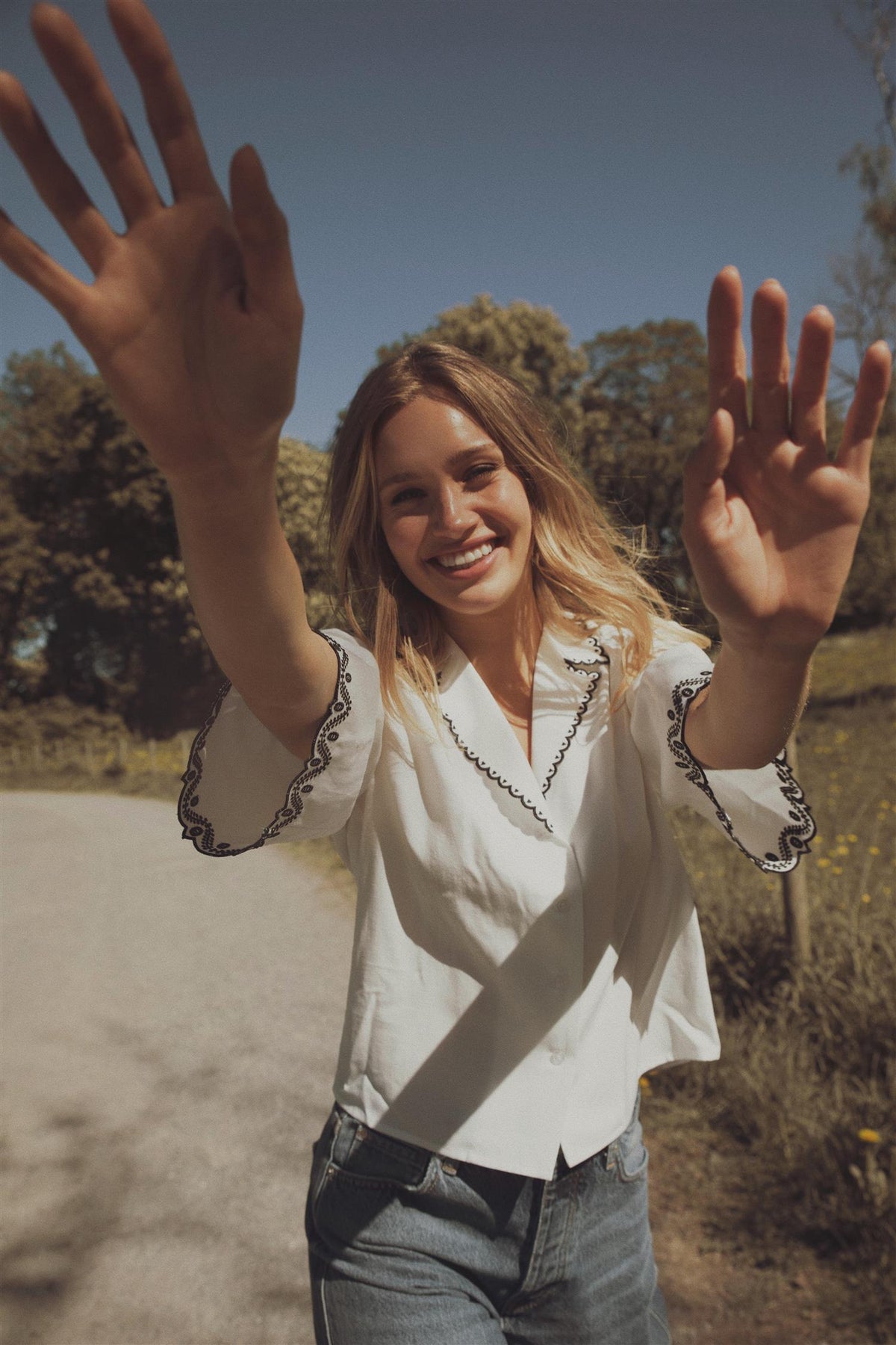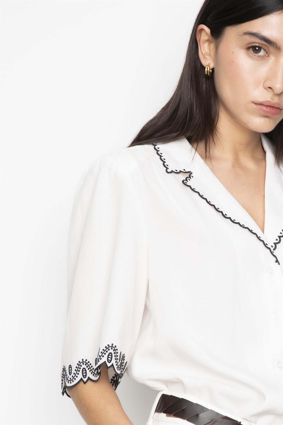 Herlig og søt bluse i krem med sorte broderier. Den har en avslappet rett fasong, og krage med åpen v-hals. Halvlange ermer og full knappestolpe. Enkel og pynte opp og ned til mange anledninger.