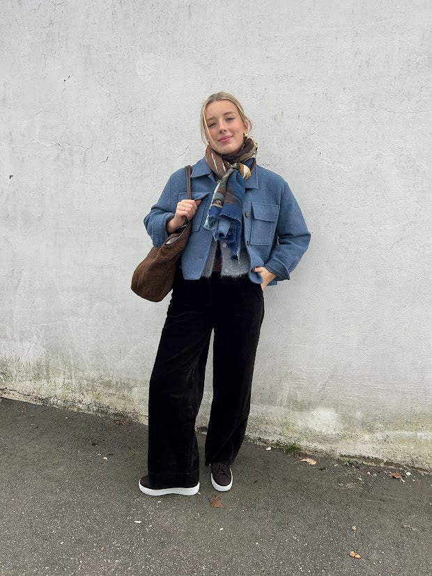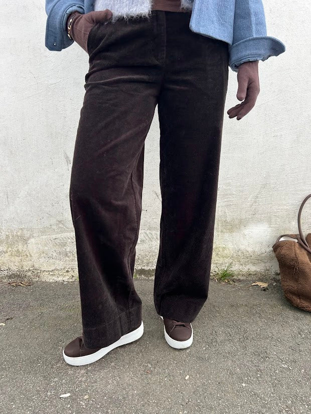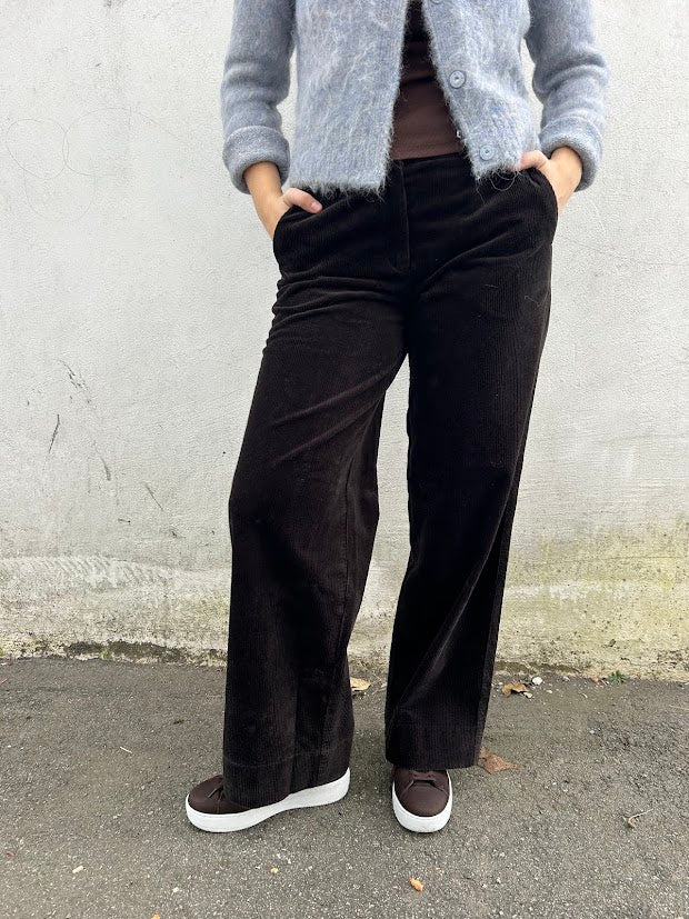 Stilig buksemodell i cord fløyel fra Five Units. Dena er høy på livet, med rette lange ben fra rompe og ned. Nydelig enkelt snitt og superbehagelig stoff. Fin som hverdags bukse eller pynt den opp til fest, den er superfin med et par hæler. Den er god på størrelsen.